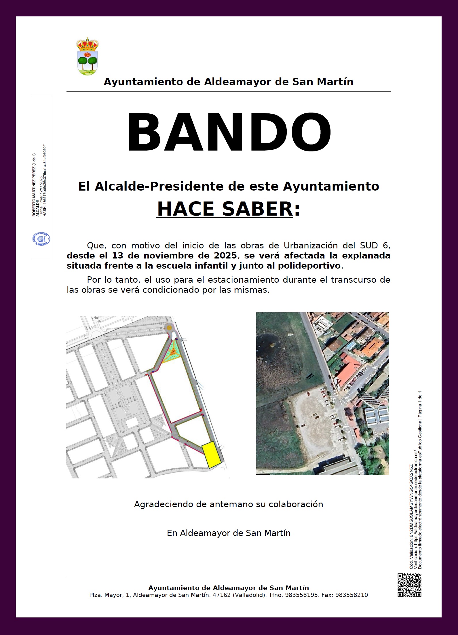 Que, con motivo del inicio de las obras de Urbanización del SUD 6, desde el 13 de noviembre de 2025, se verá afectada la explanada situada frente a la escuela infantil y junto al polideportivo.