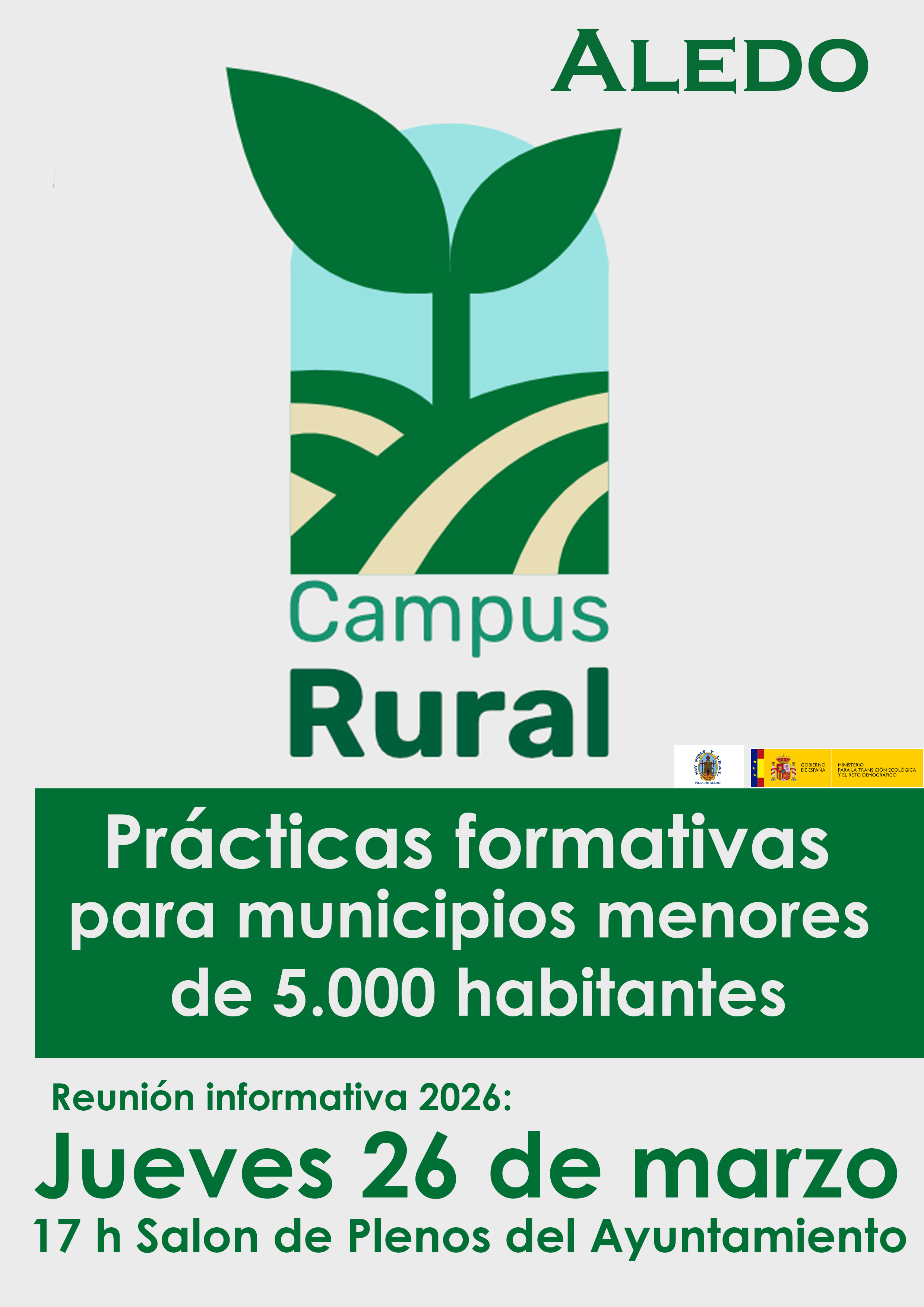 Se informa que el próximo jueves 26 de marzo a las 17h tendrá lugar una reunión informativa para el Campus Rural 2026. La reunión tendrá lugar en el salón de plenos del Ayuntamiento de Aledo con el fin de informar de esta convocatoria para realziar prácticas formativas para estudiantes universitarios/as.