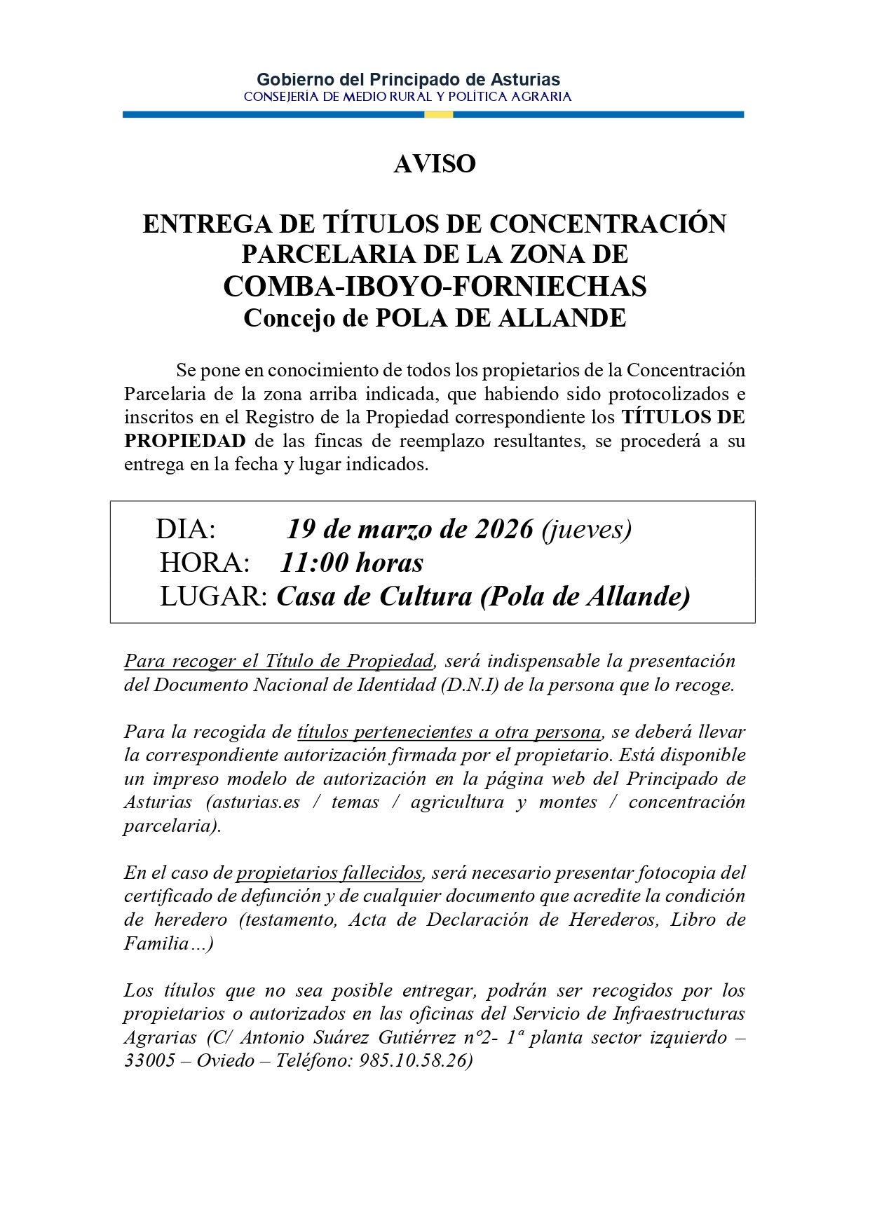 ▪️Hoy ha tenido lugar, en la Casa de Cultura de Pola de Allande, el acto de entrega de los títulos de propiedad correspondientes a la concentración parcelaria de la zona de Comba–Iboyo–Forniechas.