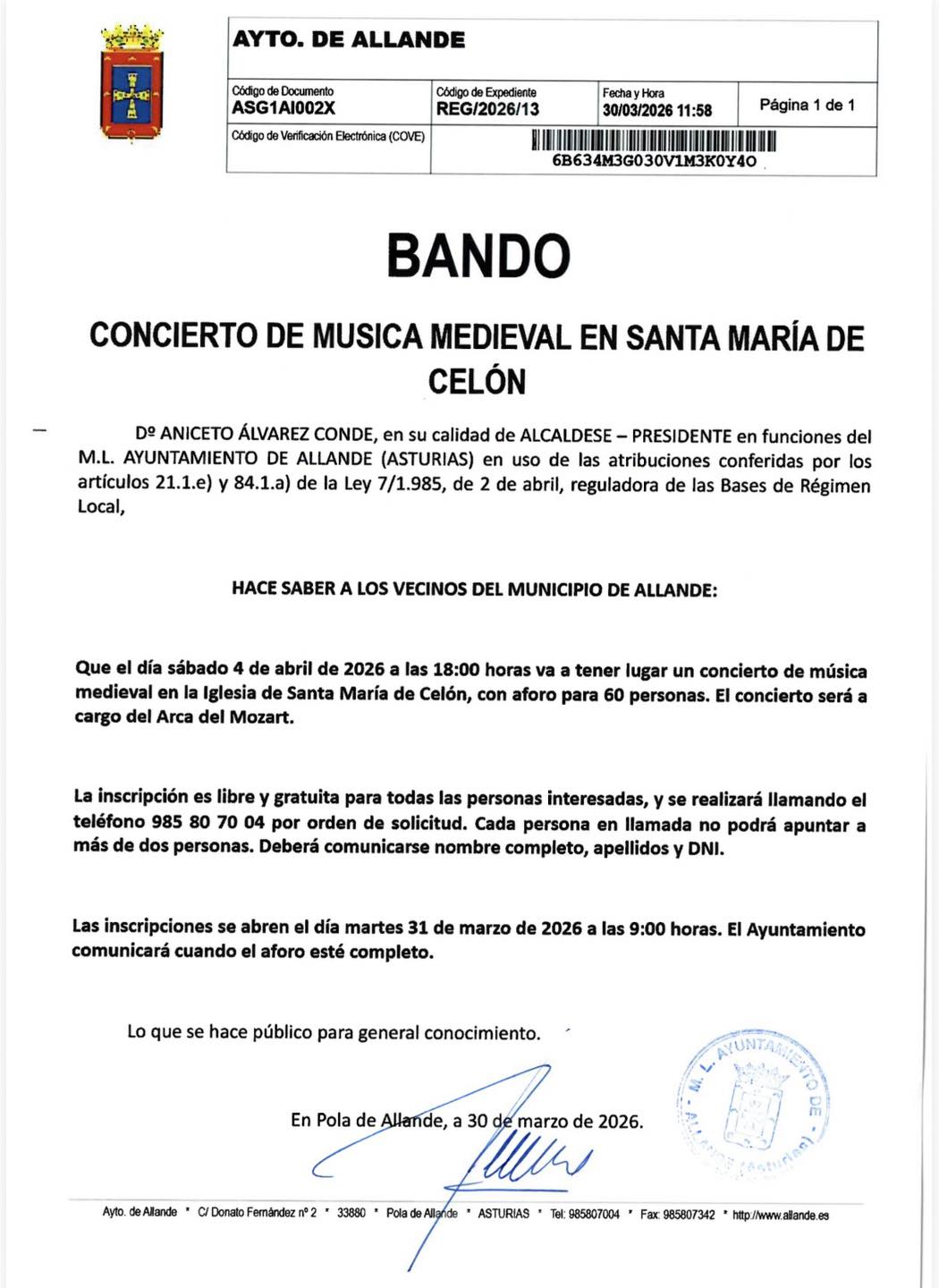 Con motivo del concierto en la Iglesia de Celón, que tendrá lugar el próximo sábado día 05 de abril de 2026, se comunica a los interesados que el Ayuntamiento de Allande pondrá a su disposición un autobús de 20 plazas.