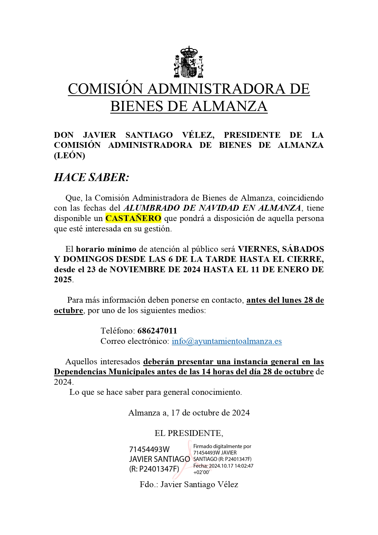 BANDO CASTAÑERO NAVIDAD ALMANZA 2024/252024-10-22 11:36:30Info GeneralQue, la Comisión Administradora de Bienes de Almanza, coincidiendo con las fechas del ALUMBRADO DE NAVIDAD EN ALMANZA, tiene disponible un CASTAÑERO que pondrá a disposición de aquella persona que esté interesada en su gestión.