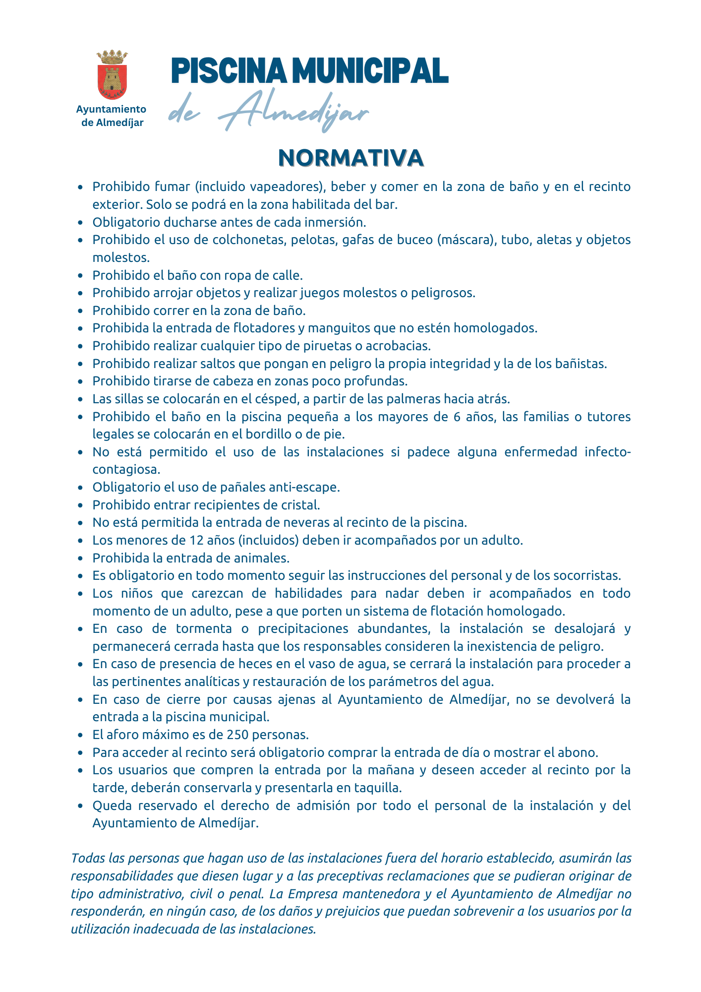 NORMATIVA PISCINA MUNICIPAL📑🏊♂️2024-06-21 11:00:00Info General🏛️Desde el Ayuntamiento os queremos presentar las normas para la piscina municipal: