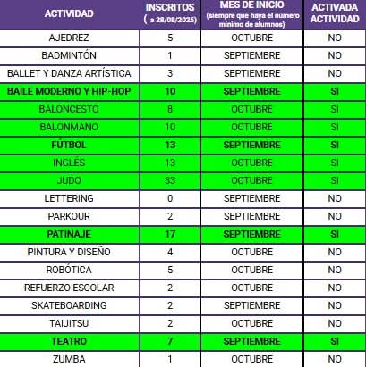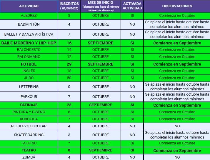 A continuación, os indico el estado actual de las actividades (actividad, inscritos a 28/08/2025, mes de inicio de la actividad, si esta activada o no la actividad por llegar al numero mínimo de inscritos):