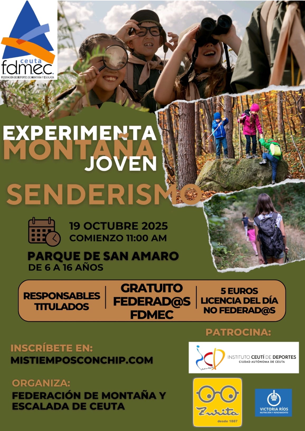 La Federación de Deportes de Montaña y Escalada de Ceuta 🧗♂️ organiza una actividad de senderismo 🚶♀️🌳 para niños y niñas de 6 a 16 años, este domingo 19 de octubre de 2025, de 11:00 a 13:15 horas 🕚 en el Parque de San Amaro 🌿.