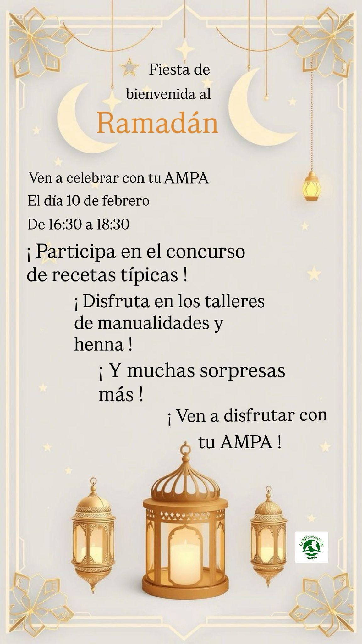 🌙✨ Os recordamos que el próximo martes día 10, a las 🕟 16:30, celebraremos en nuestro cole la 🎉 FIESTA POR EL INICIO DEL RAMADÁN 🎉