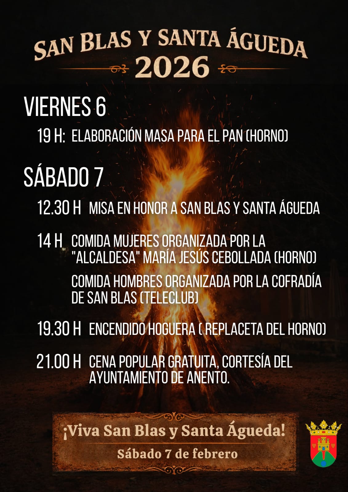 Nos comunica la Comisión de fiestas 2026, que este próximo sábado 7 de febrero, por la celebración de nuestros patrones, San Blas y Santa Águeda, darán servicio en el Horno a partir de las 12.30 del mediodía.