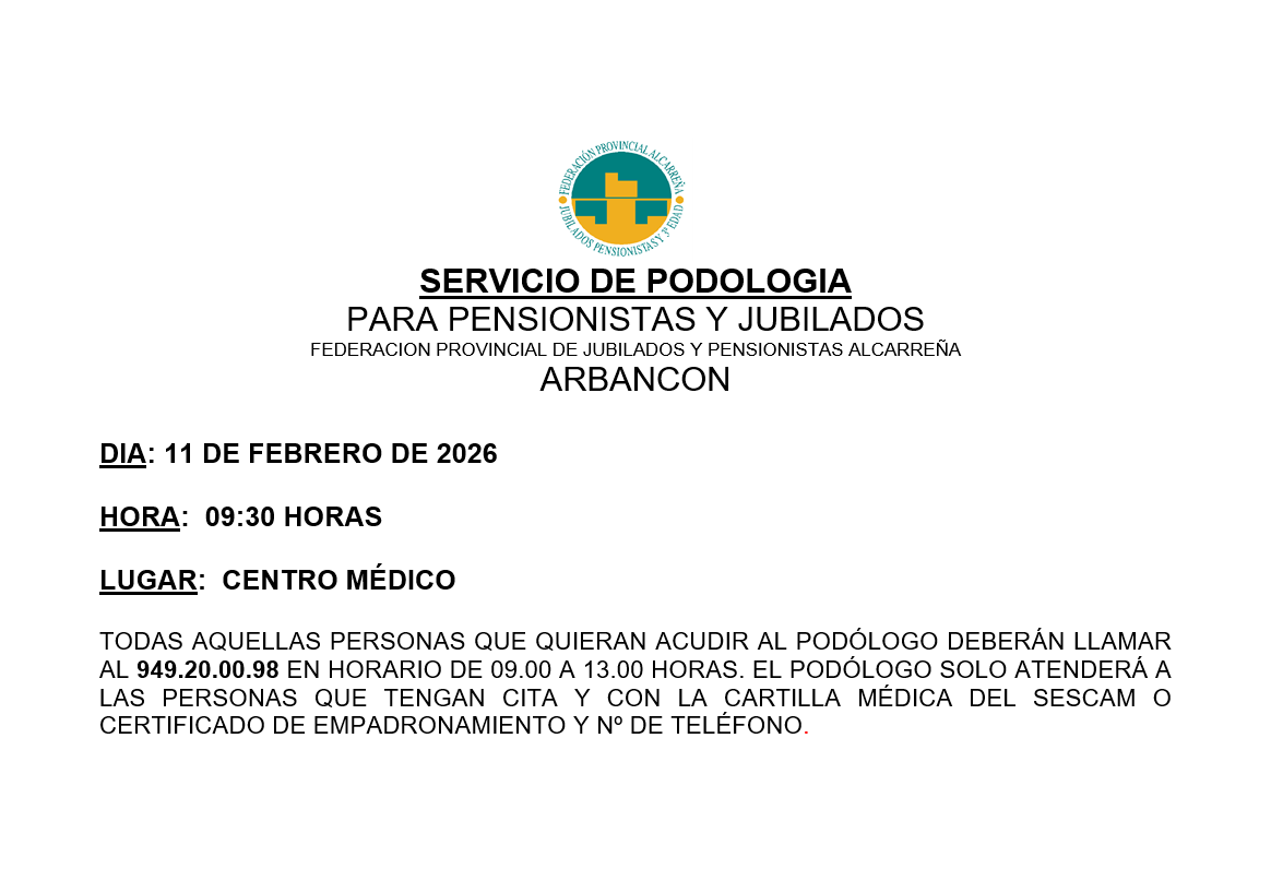 TODAS AQUELLAS PERSONAS QUE QUIERAN ACUDIR AL PODÓLOGO DEBERÁN LLAMAR AL 949 20 00 98 EN HORARIO DE 09.00 A 13.00 HORAS. EL PODÓLOGO SOLO ATENDERÁ A LAS PERSONAS QUE TENGAN CITA Y CON LA CARTILLA MÉDICA DEL SESCAM O CERTIFICADO DE EMPADRONAMIENTO Y Nº DE TELÉFONO.