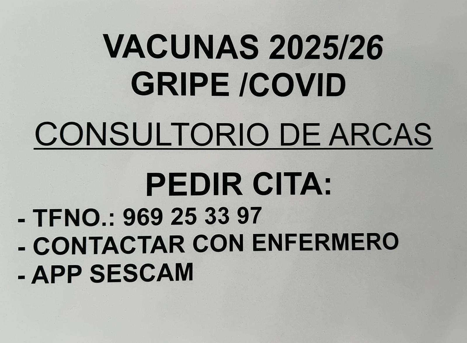 ℹ️ Información sobre las vacunas del COVID y la GRIPE en el consultorio de Arcas. Para solicitar cita o resolver dudas, póngase en contacto con el consultorio.