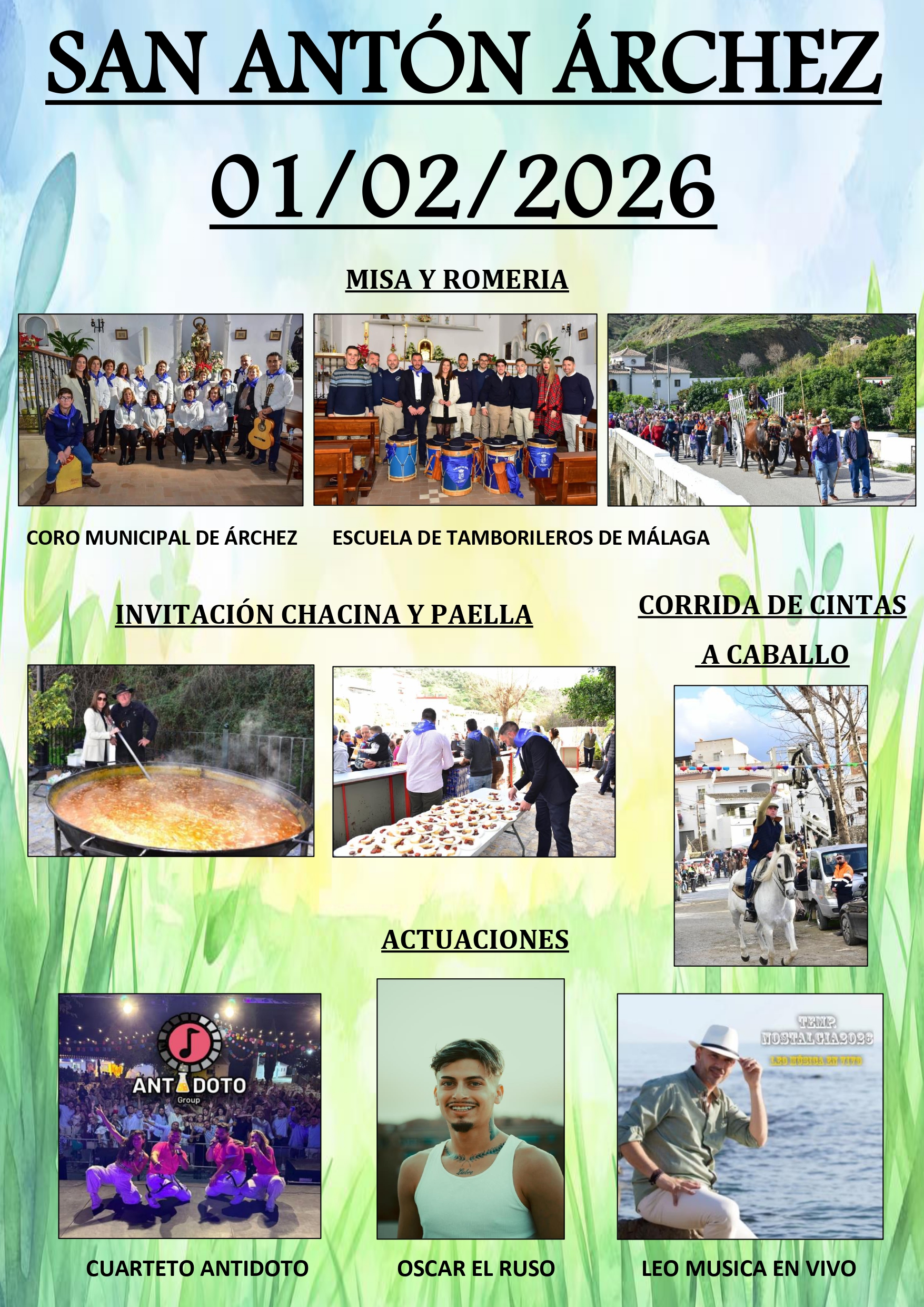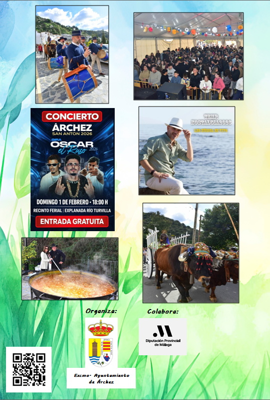 Fiesta de San Antón, domingo día 1 de febrero a partir de las 09:00h, con mercadillos, Misa Rociera y posterior Romería, invitación a chacina y paella popular, grupo musical Cuarteto Antídoto y Leo Música en Vivo, corrida de cintas a caballo y la gran actuación de: OSCAR "EL RUSO". ¡No os lo perdáis!