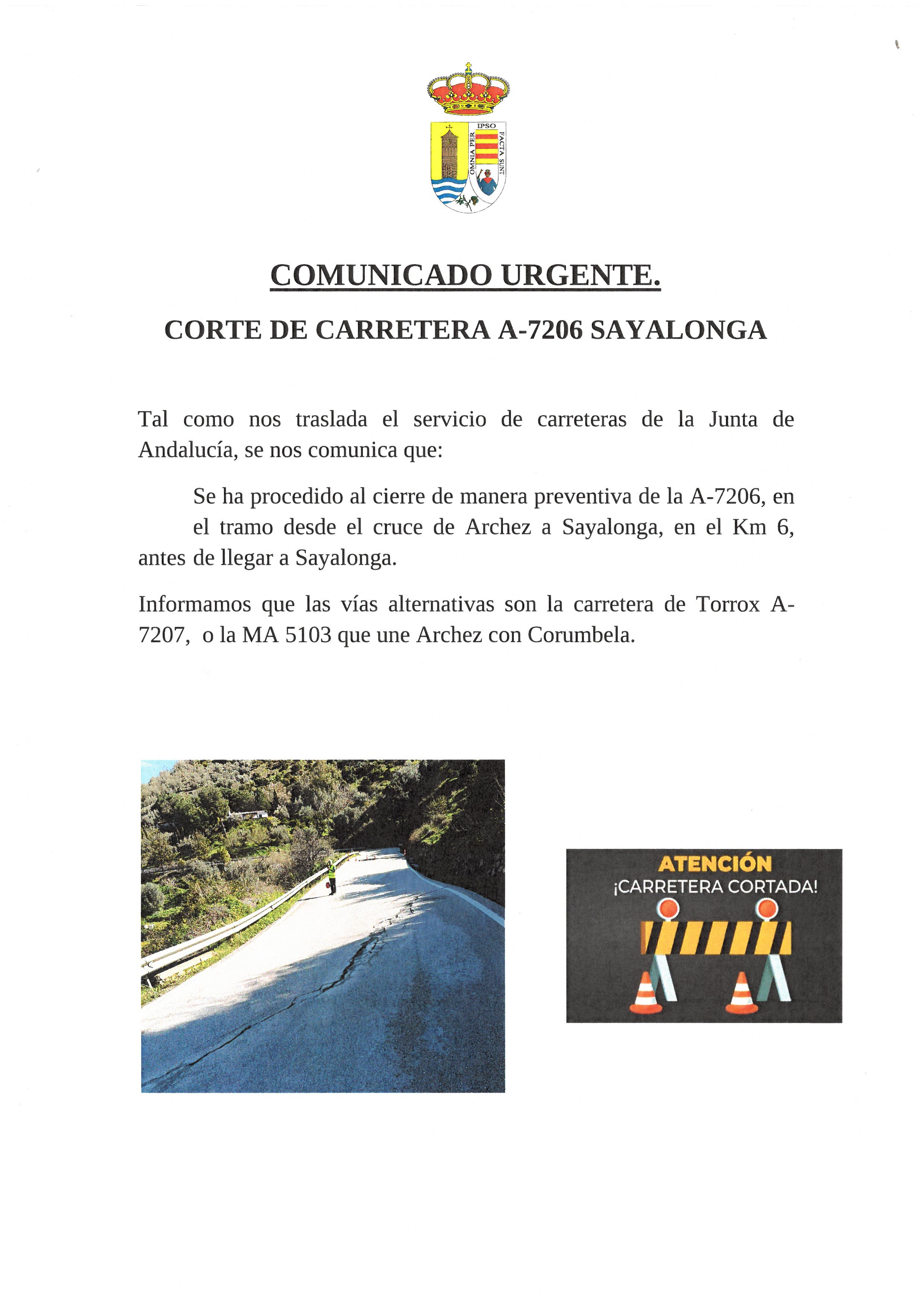 Comunicación de la Delegación Territorial de Fomento relativo al corte de la carretera A-7206 informando de que los trabajos comenzarán en breve.