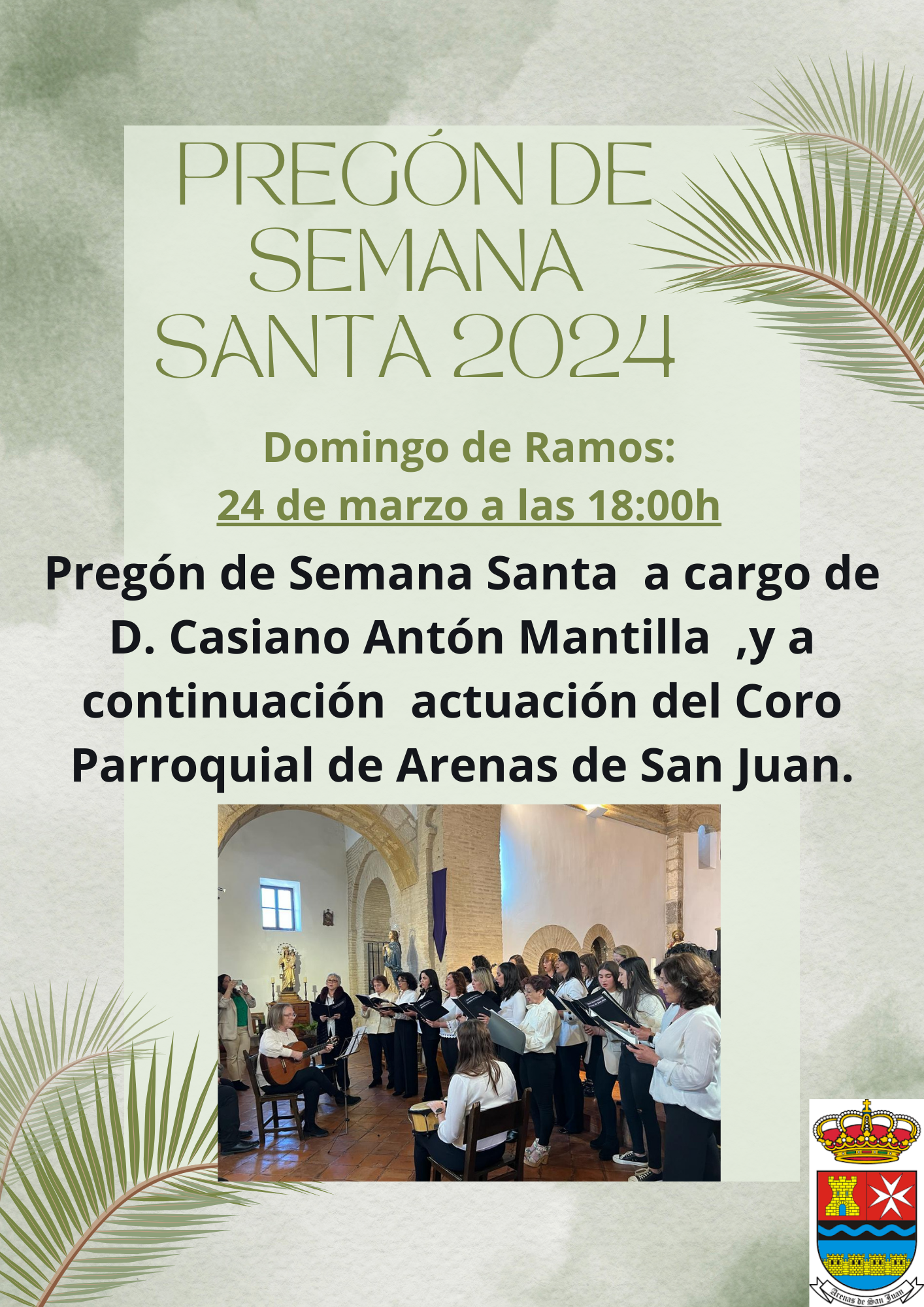 El domingo de Ramos, que es el próximo 24 de marzo a las 18h será el pregón de Semana Santa a cargo de D. Casiano Antón Mantilla y a continuación actuación del coro parroquial de Arenas de San Juan.