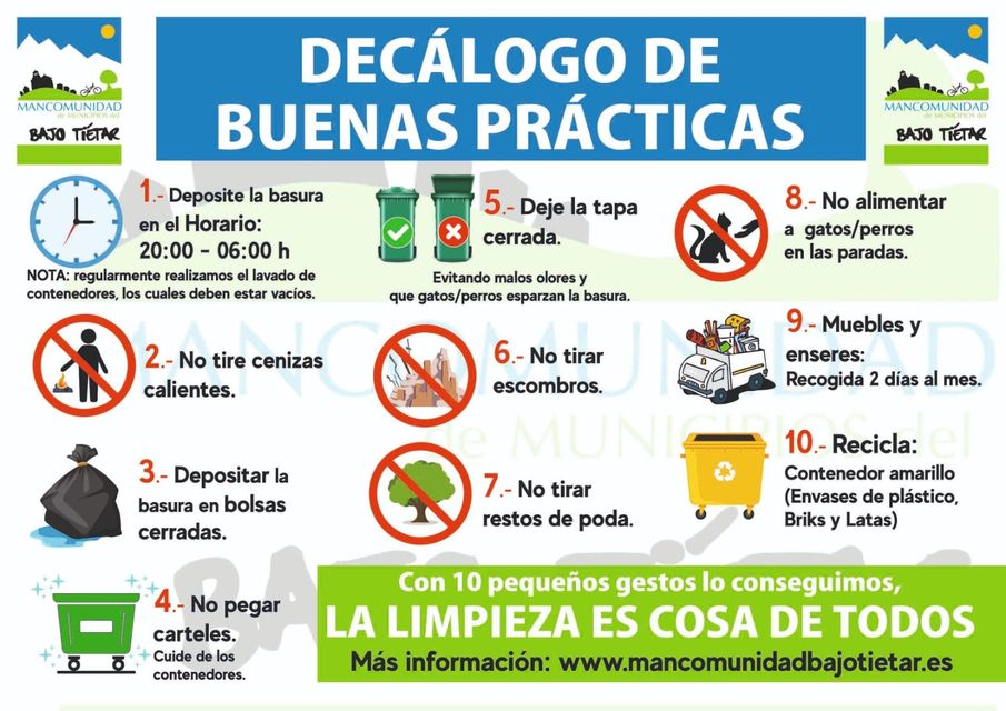 Por ello, volvemos a dar difusiรณn a la campaรฑa de concienciaciรณn destinada a toda la poblaciรณn, con el decรกlogo de buenas prรกcticas, para gestionar nuestros residuos, y de esta forma respetar las normas bรกsicas de convivencia entre vecinos.๐๐ฒ๐ฐรก๐น๐ผ๐ด๐ผ ๐ฑ๐ฒ ๐ฏ๐๐ฒ๐ป๐ฎ๐ ๐ฝ๐ฟรก๐ฐ๐๐ถ๐ฐ๐ฎ๐๐น- Deposite la basura en el horario establecido, de 20:00 a 5:00h. ๐น- No tire cenizas calientes. ๐น- Depositar la basura en bolsas cerradas. ๐น- No pegar carteles en los contenedores. ๐น- Dejar la tapa cerrada para evilar malos olores y que los animales esparzan la basura. ๐น- No tirar escombros. ๐น- No tirar restos de poda. ๐น- Alimentar a gatos/perros en las paradas de basura. ๐น- Los muebles y enseres tienen dos dรญas de recogida al mes. ๐น- Recicla.