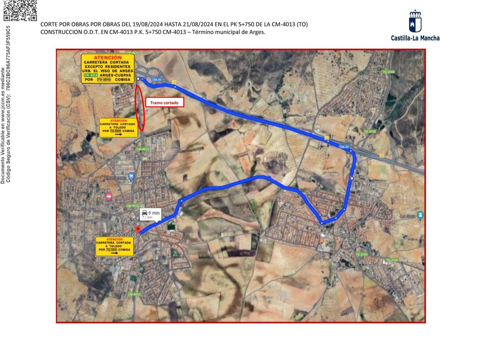 Corte de Carretera CM-40132024-08-13 09:29:30Info GeneralEl servicio de carreteras de Castilla-La Mancha, informa que desde las 08:00 horas del lunes 19 de agosto hasta las 18:00 horas del miércoles 21 de agosto, el tramo de carretera situado entre las glorietas situadas en el p.k 6,155 (rotonda de la noria intersección con la Avenida del Moro de Argés) y la glorieta situada en la CM-40 de acceso a la CM-4013, permanecerá cortado con motivo de las obras de construcción de drenaje transversal que tendrán lugar en el p.k 5,750 de Argés.