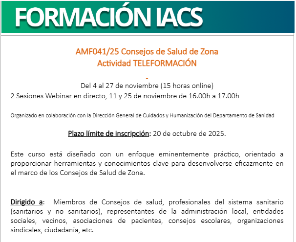 En el mes de noviembre se va a impartir un curso sobre Consejos de Salud de Zona dirigido, principalmente, a miembros externos de los Consejos de Salud: representantes de la administración local, entidades sociales, vecinos, asociaciones de pacientes, consejos escolares, organizaciones sindicales, ciudadanía, etc.