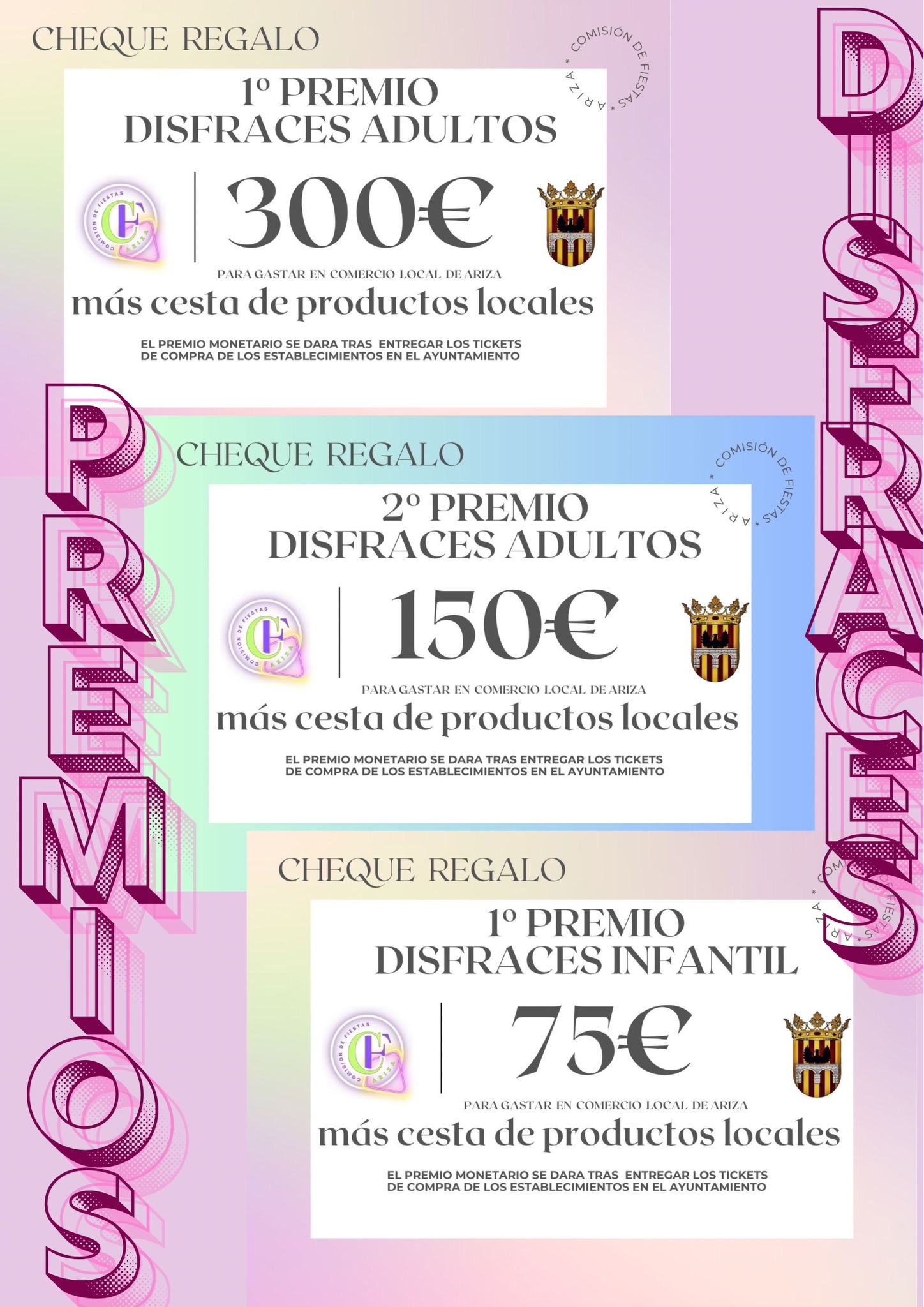 Adjuntamos imagen para recordar los premios que se van a otorgar este año en el concurso de disfraces, compuestos por lotes de productos de la localidad y una aportación económica que los ganadores podrán reembolsarse sólo con presentar tickets de compra de cualquier establecimiento de Ariza.