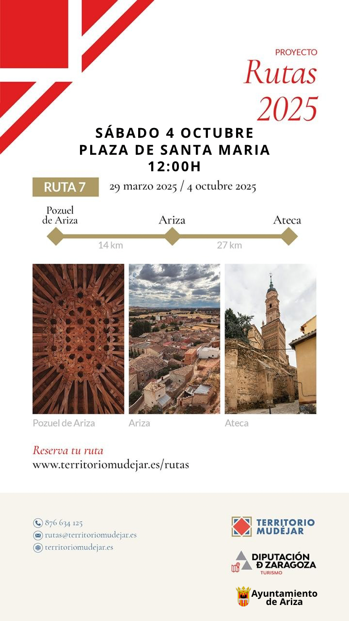 El sábado, 4 de octubre de 2025, recibiremos el segundo grupo de visitantes de 2025 que participa en las rutas de Territorio Mudéjar, organizada por esa asociación de ayuntamientos de la que formamos parte el Ayuntamiento de Ariza. Se trata de una visita abierta; cualquier persona de nuestro pueblo interesada, puede participar y conocer nuestro patrimonio.