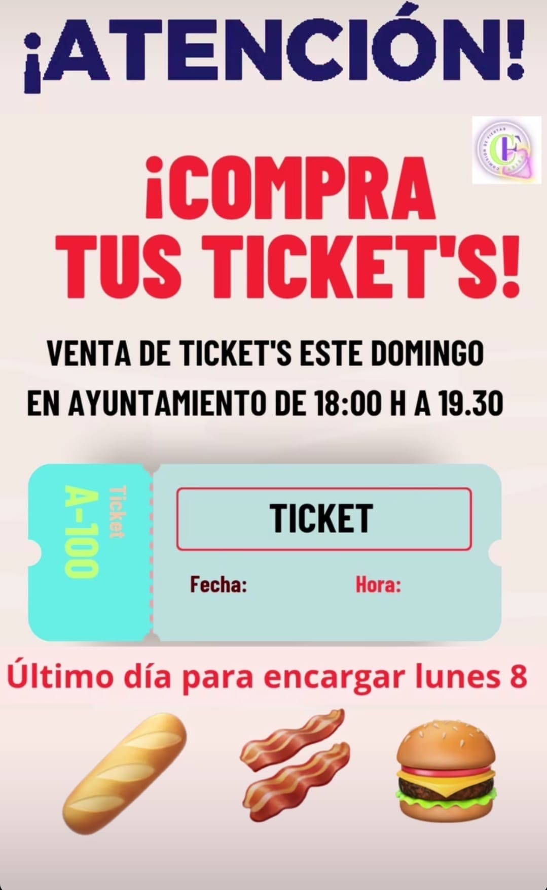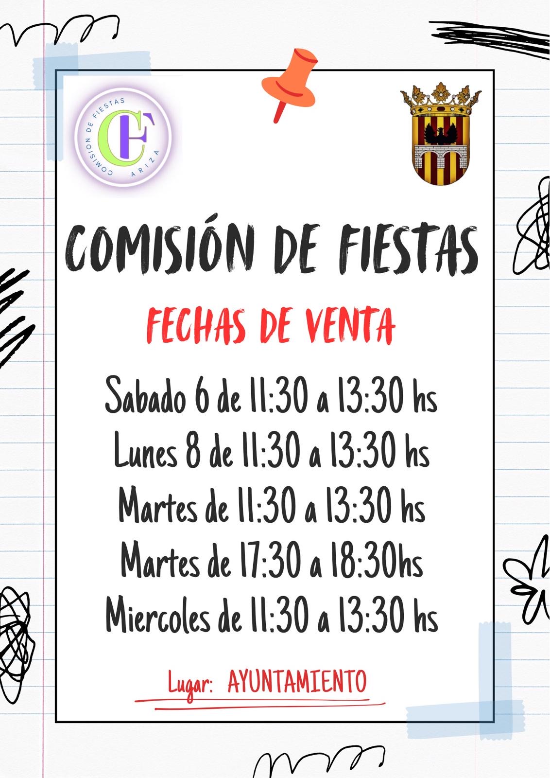 La comisión de fiestas pondrá punto de venta en el Ayuntamiento los días y horas marcados en el cartel. Los precios los tienen en el archivo adjunto.