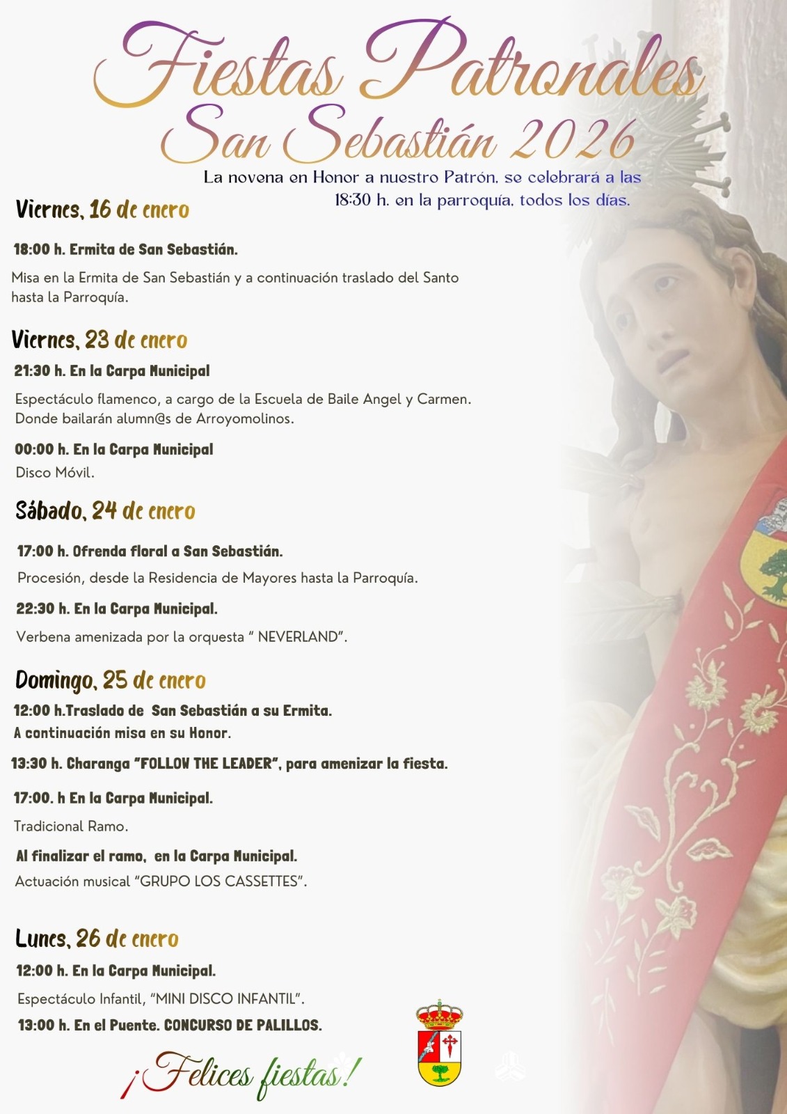 🎉 Fiestas Patronales en Honor a San Sebastián 2026 🎉2026-01-16 13:27:05Info GeneralVecinas y vecinos de Arroyomolinos, ya está todo preparado para celebrar nuestras tradicionales Fiestas Patronales de San Sebastián, unos dÃas llenos de actos religiosos, música, baile y convivencia para todas las edades.