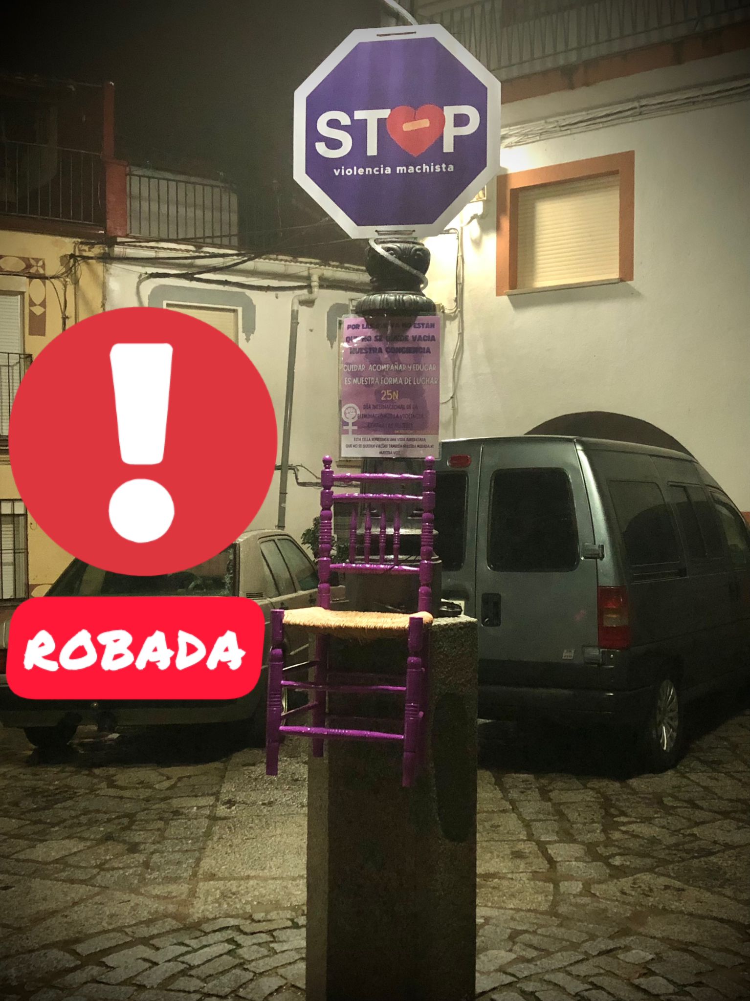 La persona o personas que se hayan llevado la Silla Violeta que estaba puesta en la farola de la Plaza como símbolo del 25N que haga el favor de devolverla, bien en el Ayuntamiento, a cualquiera de las personas del 8M o dejarla donde estaba. Esa silla tiene dueña y tiene un gran valor sentimental para la dueña. Se ruega entregarla. -