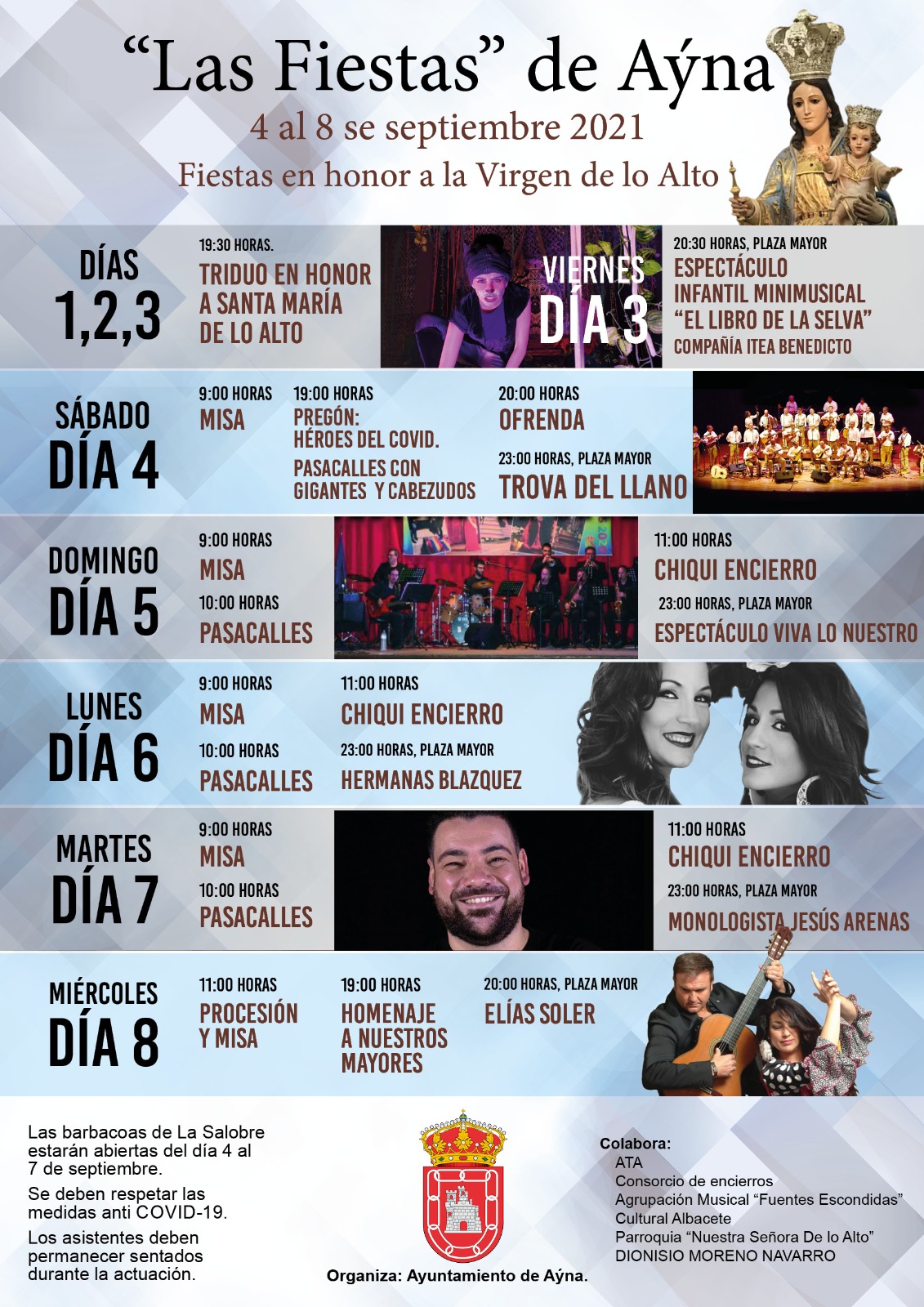 El Ayuntamiento de Aýna ha elaborado un programa de actividades por las fiestas en honor a la Virgen de lo Alto, dentro de las posibilidades por la pandemia del Covid. Se llevarán a cabo del 4 al 8 de septiembre e invitamos a todos a vivirlo con responsabilidad, teniendo presente que la pandemia no ha terminado. Esperamos que disfrutéis del programa y que en 2022 sí podamos celebrar nuestras fiestas como tradicionalmente se ha hecho.