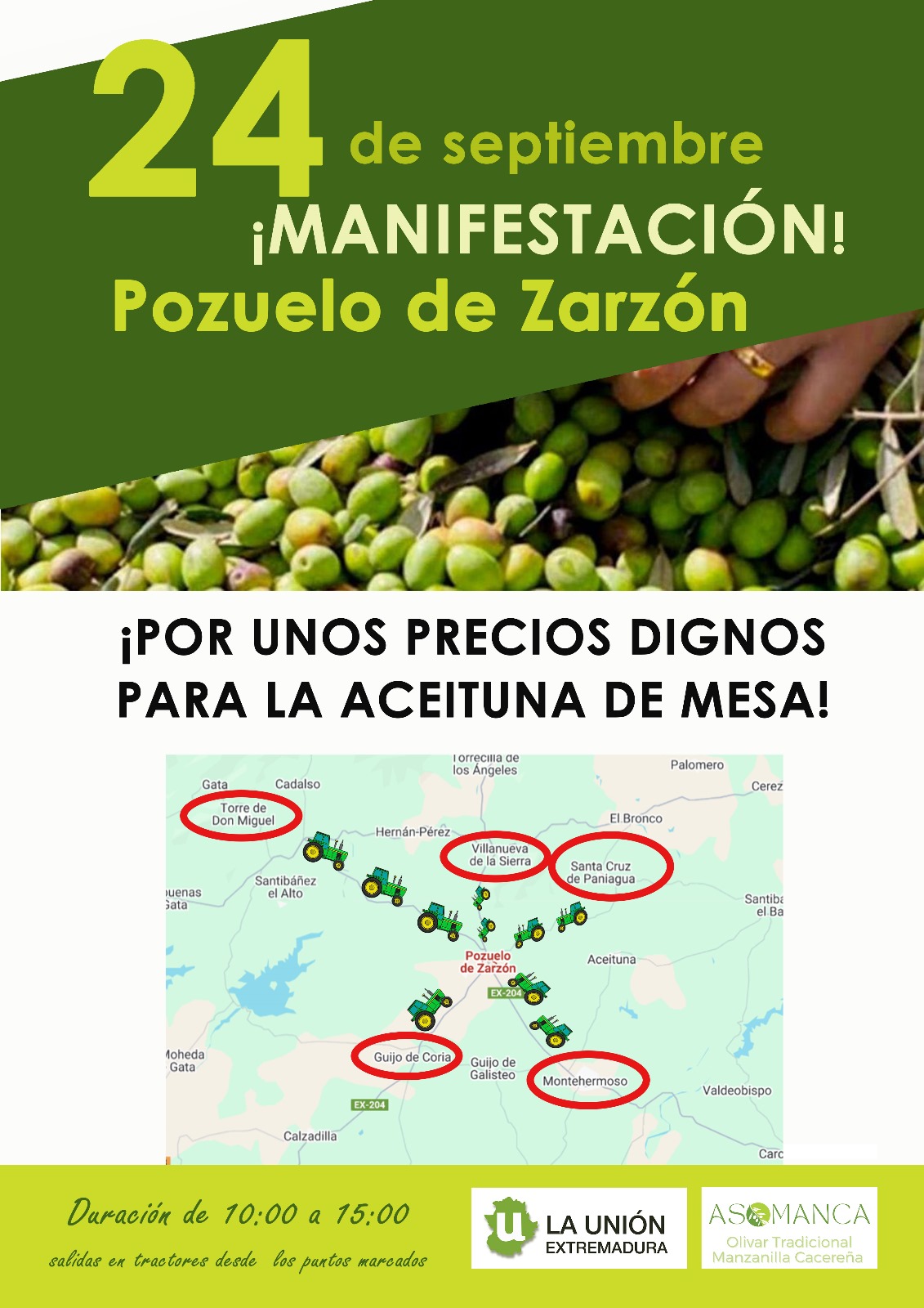 Adjuntamos cartel informativo de la Manifestación convocada hoy en Pozuelo de Zarzón por unos precios DIGNOS para la aceituna de mesa.