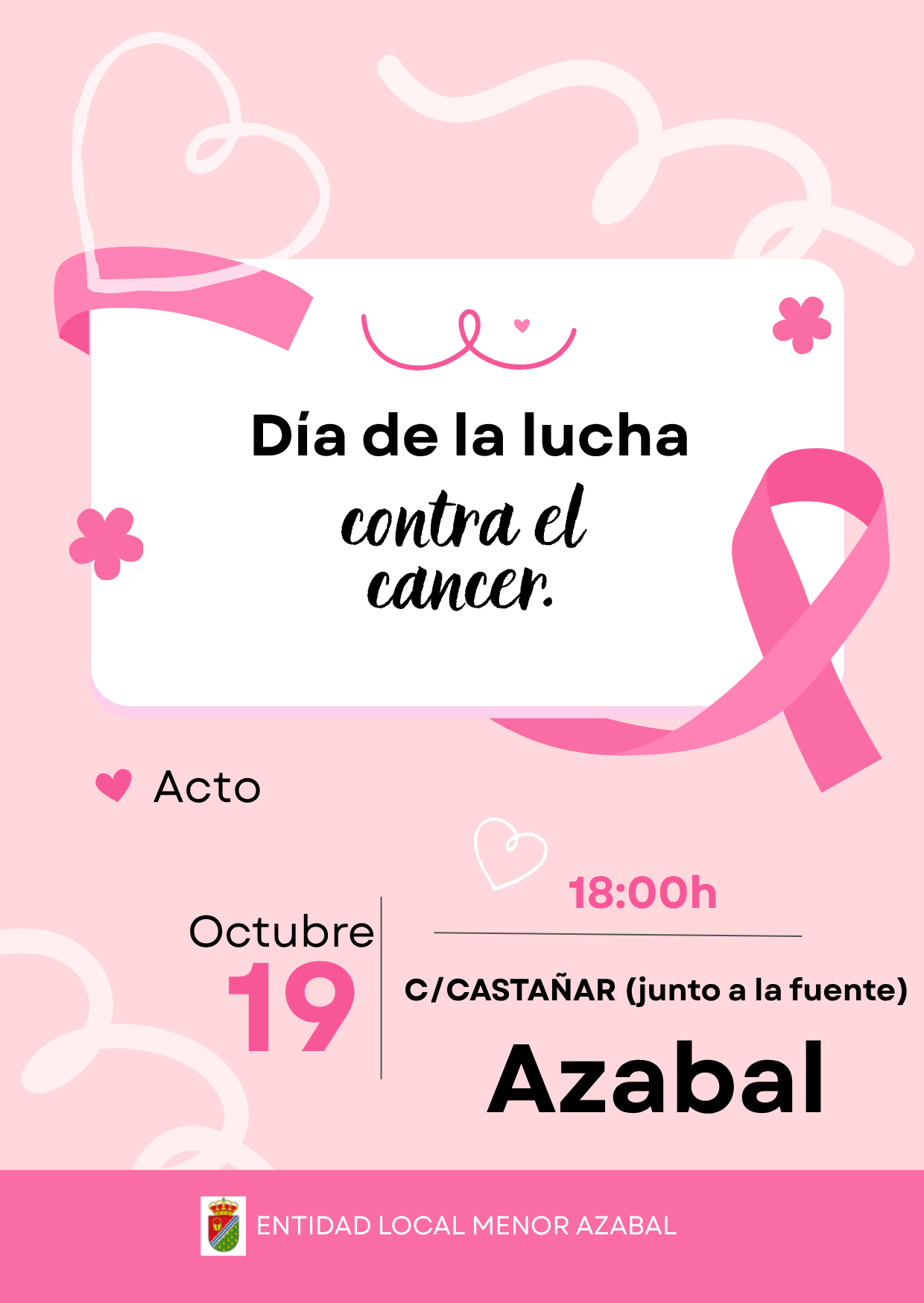 Se informa a todos los vecinos y vecinas, que con motivo del Día Internacional contra el Cáncer de Mama, el próximo domingo 19 de octubre, a las 18h, tendrá lugar en Azabal un acto solidario contra el Cáncer, en la Fuente situada en la Calle Castañar, con el objetivo de sensibilizar a la ciudadanía y mostrar nuestro apoyo a todas las personas afectadas con esta enfermedad.