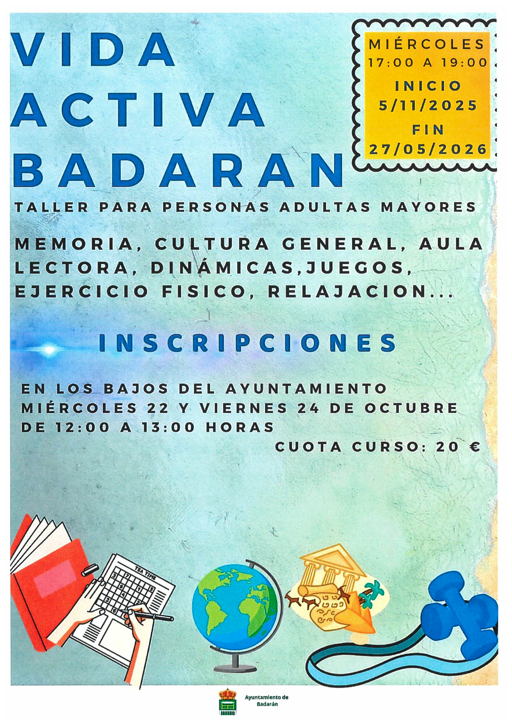 El próximo miércoles 15 de octubre de 9:15 A 11:15 h en el Salón de Plenos del Ayuntamiento de Badarán.