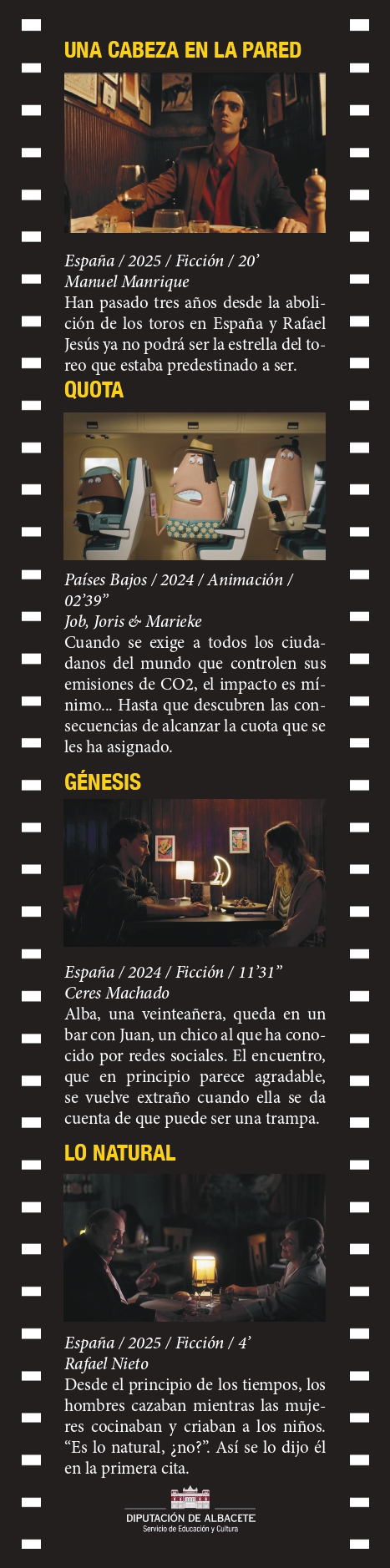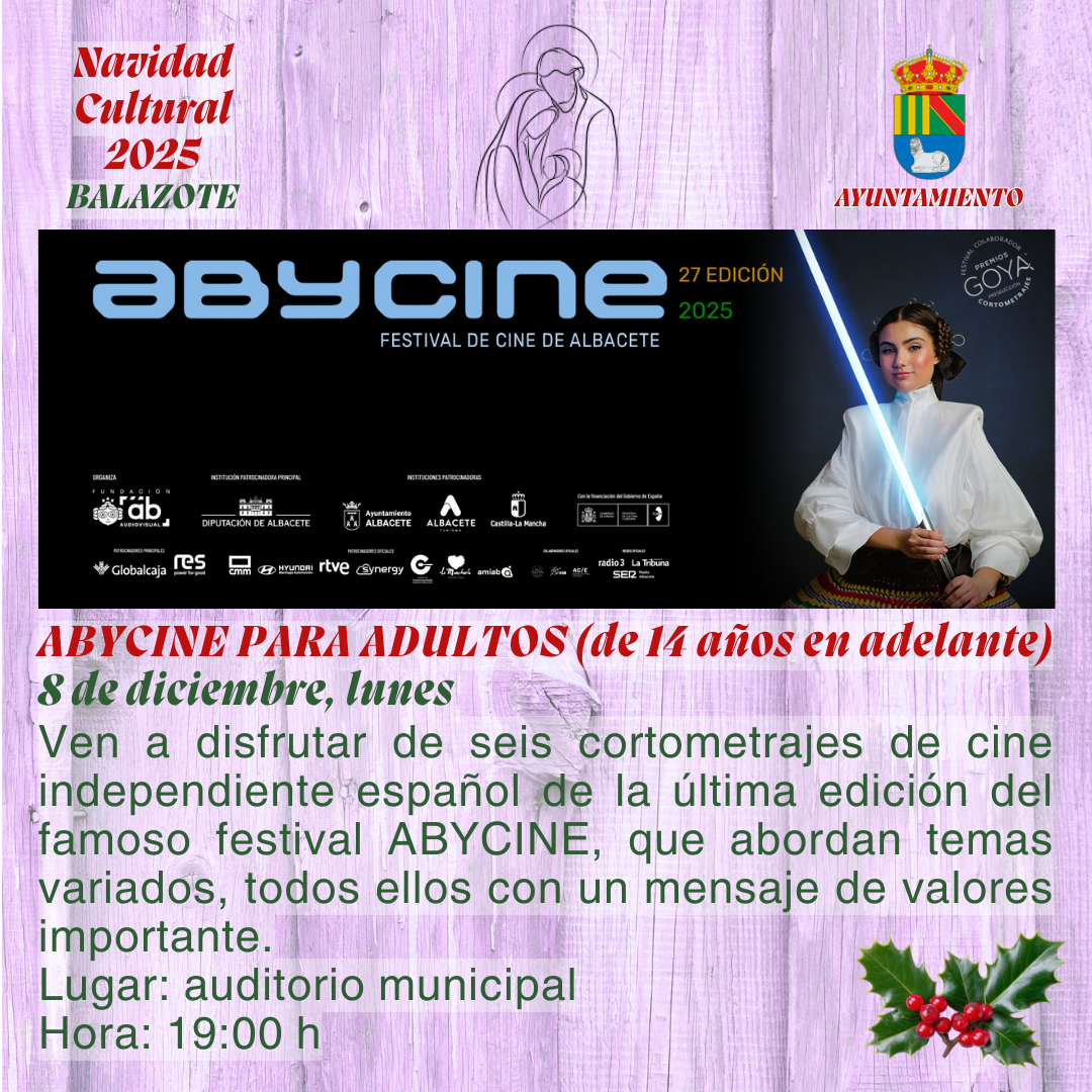 Proyección de siete cortometrajes destacados de la última edición del festival ABYCINE. Las obras incluyen técnicas y temáticas variadas y abordan distintos valores. Es la primera vez que este ciclo se celebra en Balazote para adultos.