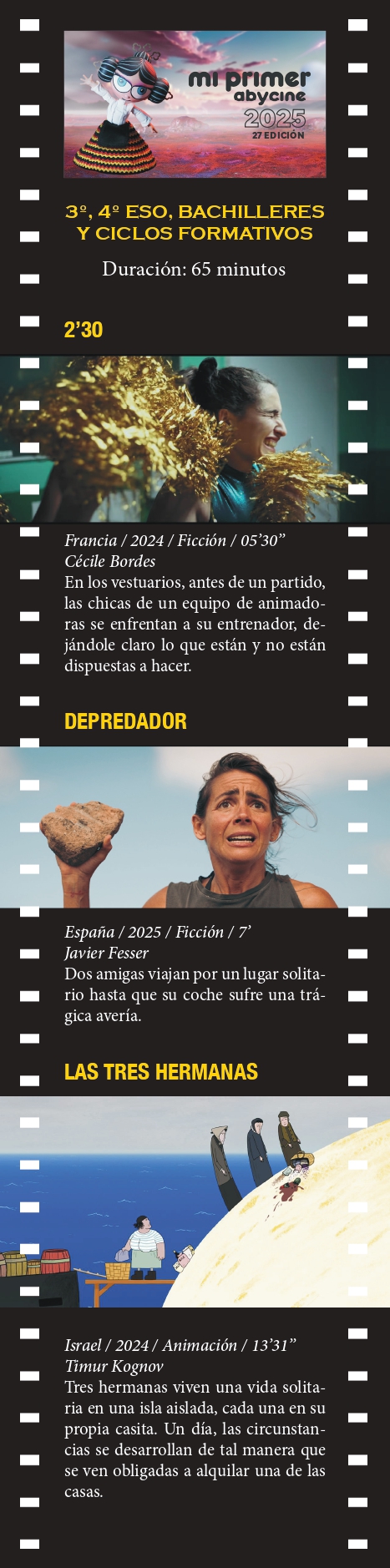 Proyectaremos siete cortometrajes destacados de la última edición del festival ABYCINE, todos ellos con técnicas y temáticas variadas, y cargados de valores.