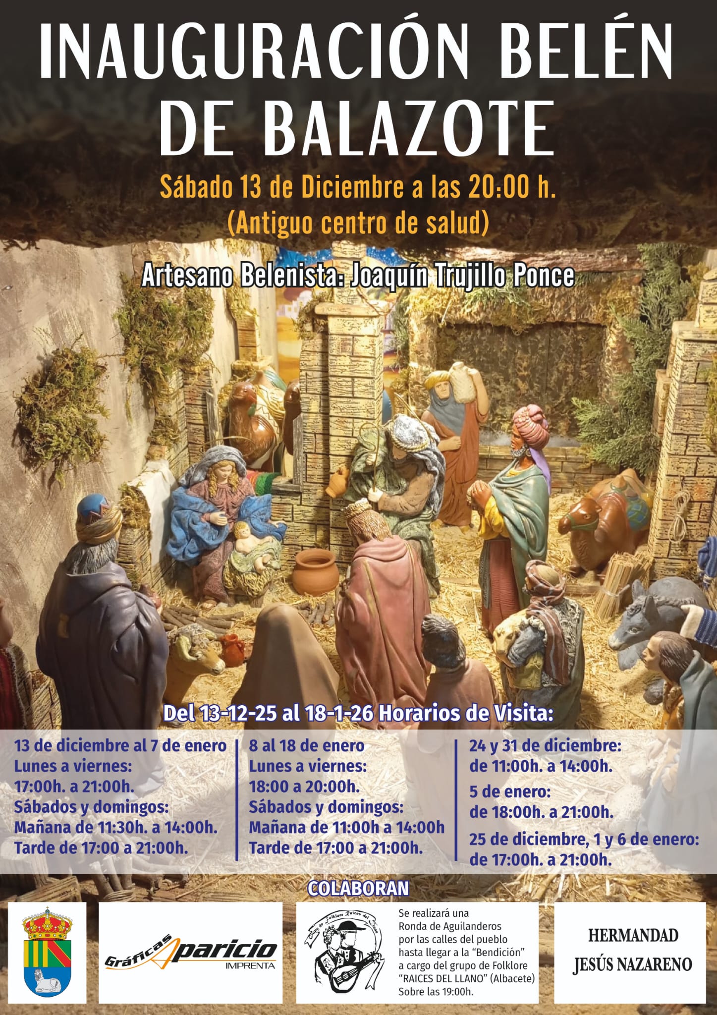 El Ayuntamiento de Balazote ha preparado un amplio programa para la Navidad Cultural 2025, con 31 actividades de carácter cultural, deportivo, festivo y diversos concursos. Este año se incorporan importantes novedades, todo ello con el objetivo de ofrecer propuestas para todas las edades y celebrar unas fiestas tan entrañables disfrutándolas en compañía de la familia, amigos, vecinos y visitantes.