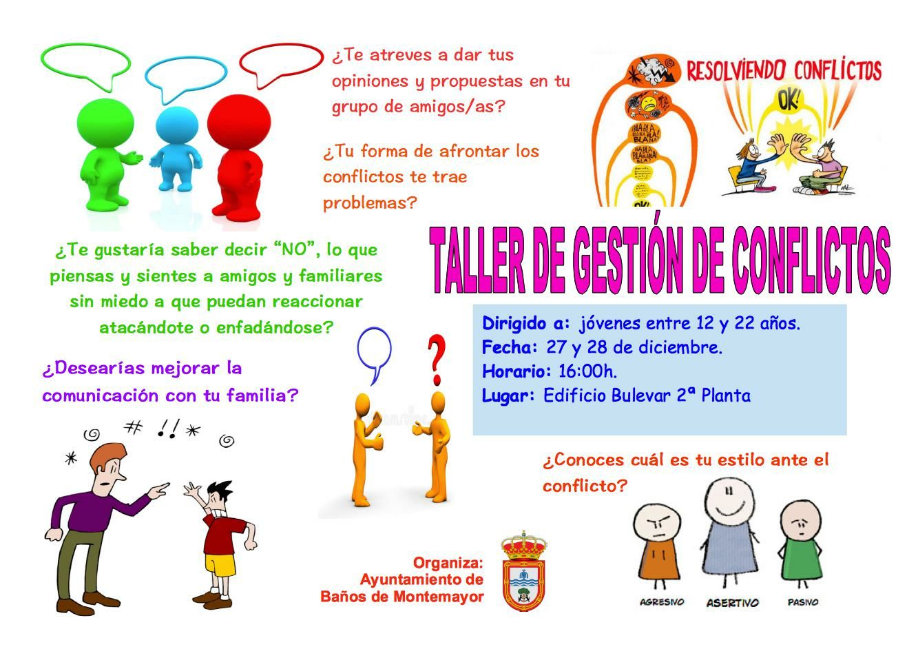 Se informa de que los próximos días 27 y 28 de diciembre, se impartirá un taller de gestión de conflictos dirigido a jóvenes de entre 12 y 22 años en la sala de conferencias del edificio polivalente del bulevar.