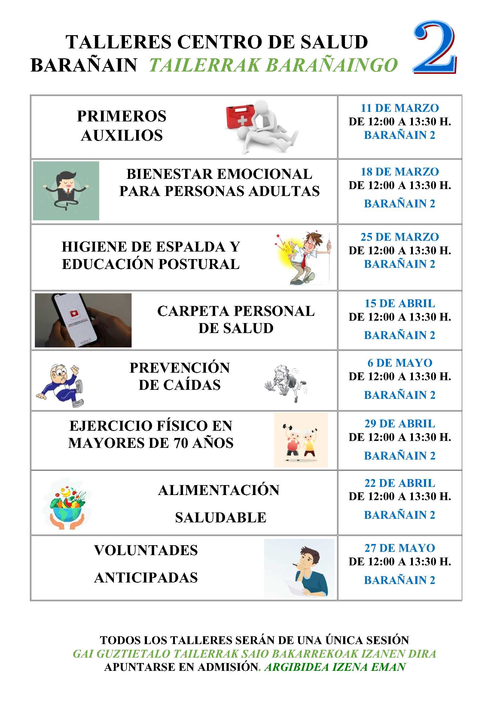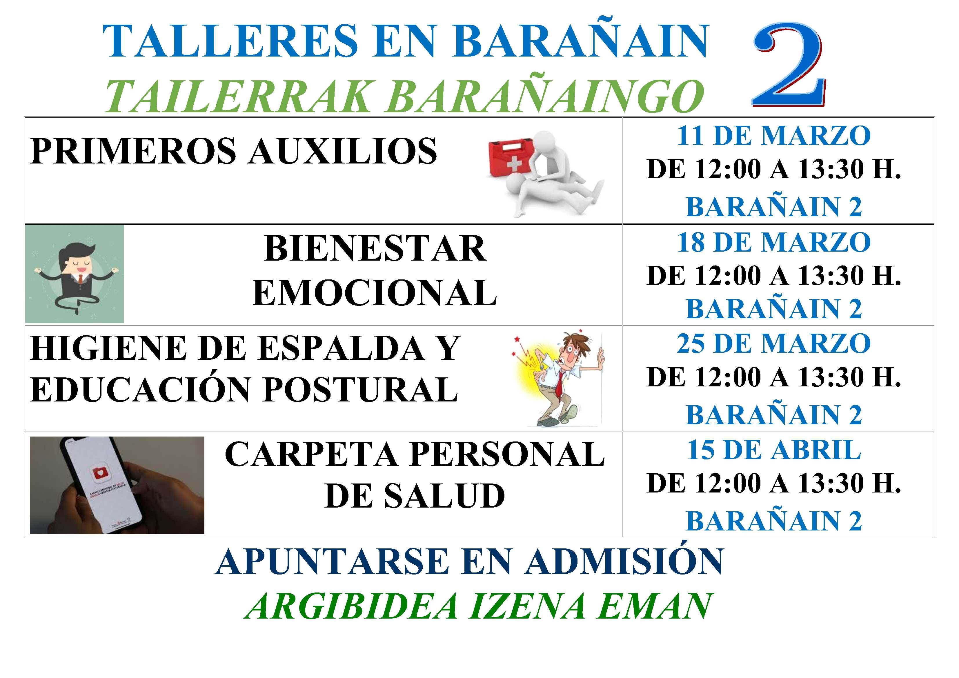 Información sobre la programación de los próximos talleres que se van a realizar en los próximos meses en el Centro de Salud de Barañain 2 dirigidos a toda la población de Barañain en general.