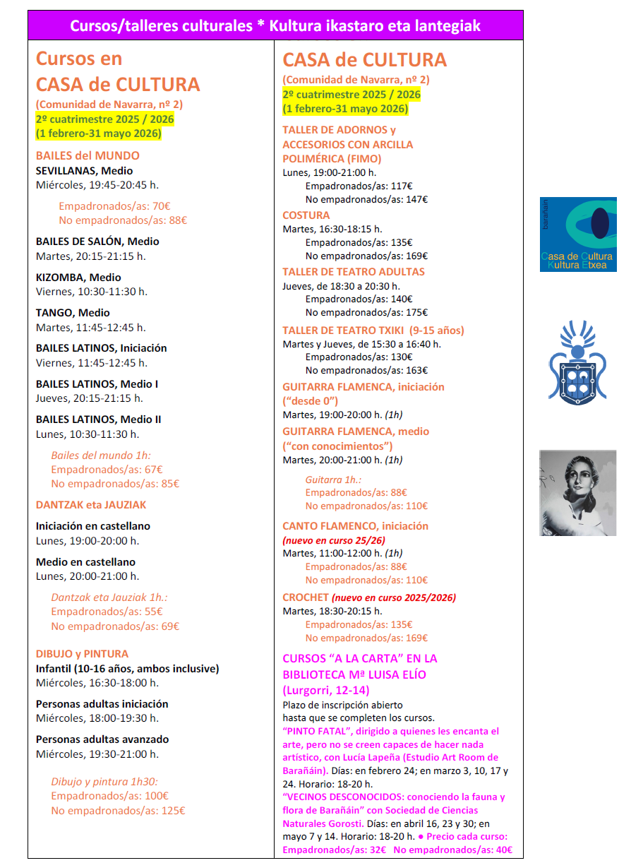 El Ayuntamiento de Barañáin informa de las fechas de comienzo de las clases para el 2º cuatrimestre (continuación del primer cuatrimestre cuyas sesiones finalizan el 31 de enero):Cursos culturales Casa de Cultura 2025-2026 Comienzo Clases 2º cuatrimestre Febrero 2026 (pdf)