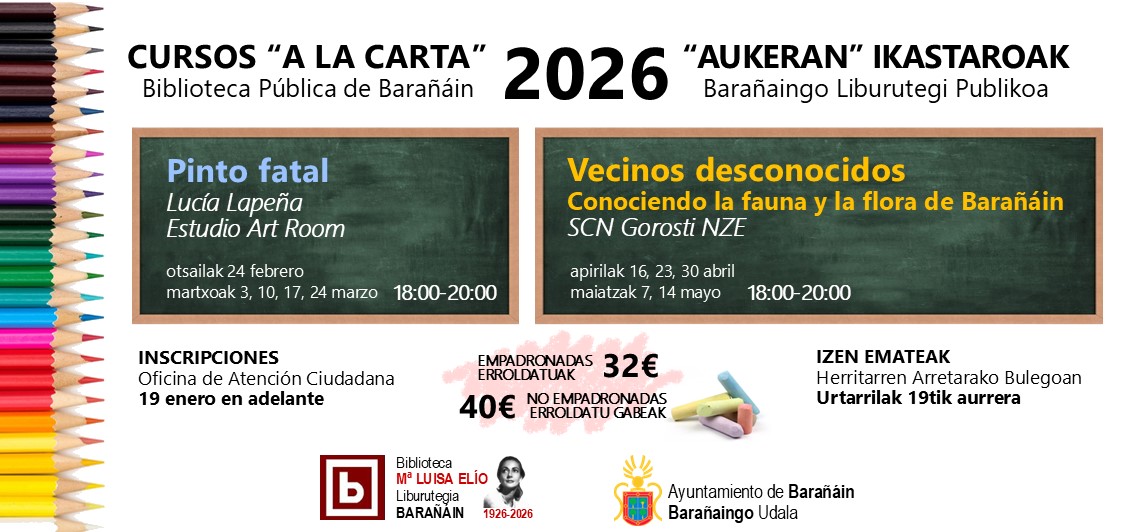 Barañaingo Udalak 2026ko urtarrilean irekiko du izena emateko epea, Kultura Etxeko kultura-jardueretan 1. lauhilekoan izena emanda zaudetenok 2. lauhilekorako izen-ematea berritzeko (ikastaro eta ordutegi berean) eta/edo Kultura Etxeko eta Liburutegiko jardueretan izen-emate berriak egiteko (Kultura Etxeko ikastaroak eta Mª Luisa Elio liburutegiko ikastaroen eskaintza berria). Ikastaroak 2025/2026 ikasturteko 2. lauhilekorako (2026ko otsailaren 1etik maiatzaren 31ra) zuzenduak dira (K(...)