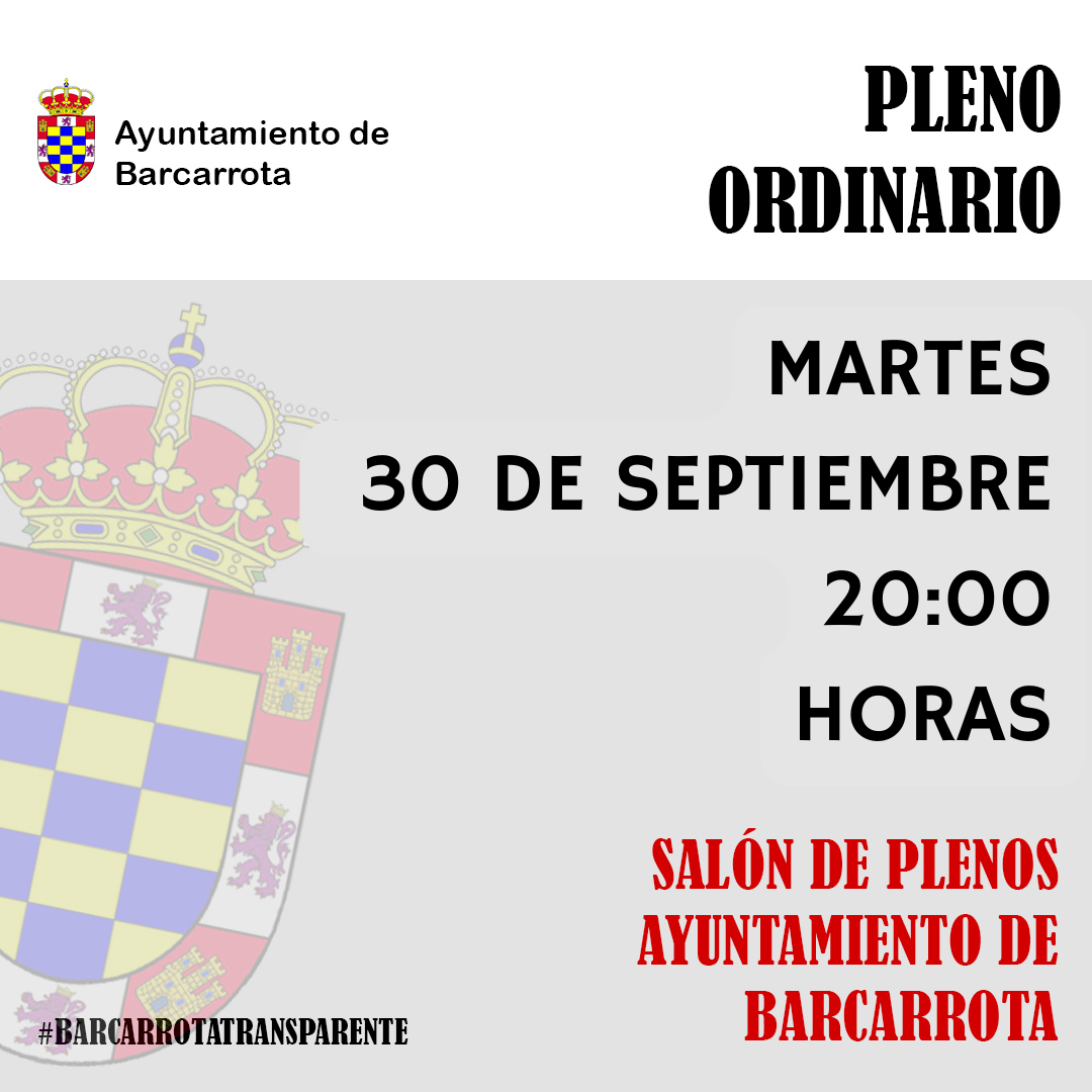 Mañana 𝐦𝐚𝐫𝐭𝐞𝐬 𝟑𝟎 𝐝𝐞 𝐬𝐞𝐩𝐭𝐢𝐞𝐦𝐛𝐫𝐞 𝐚 𝐥𝐚𝐬 𝟐𝟎:𝟎𝟎 𝐡𝐨𝐫𝐚𝐬 se celebrará una sesión ordinaria del Pleno de Barcarrota.