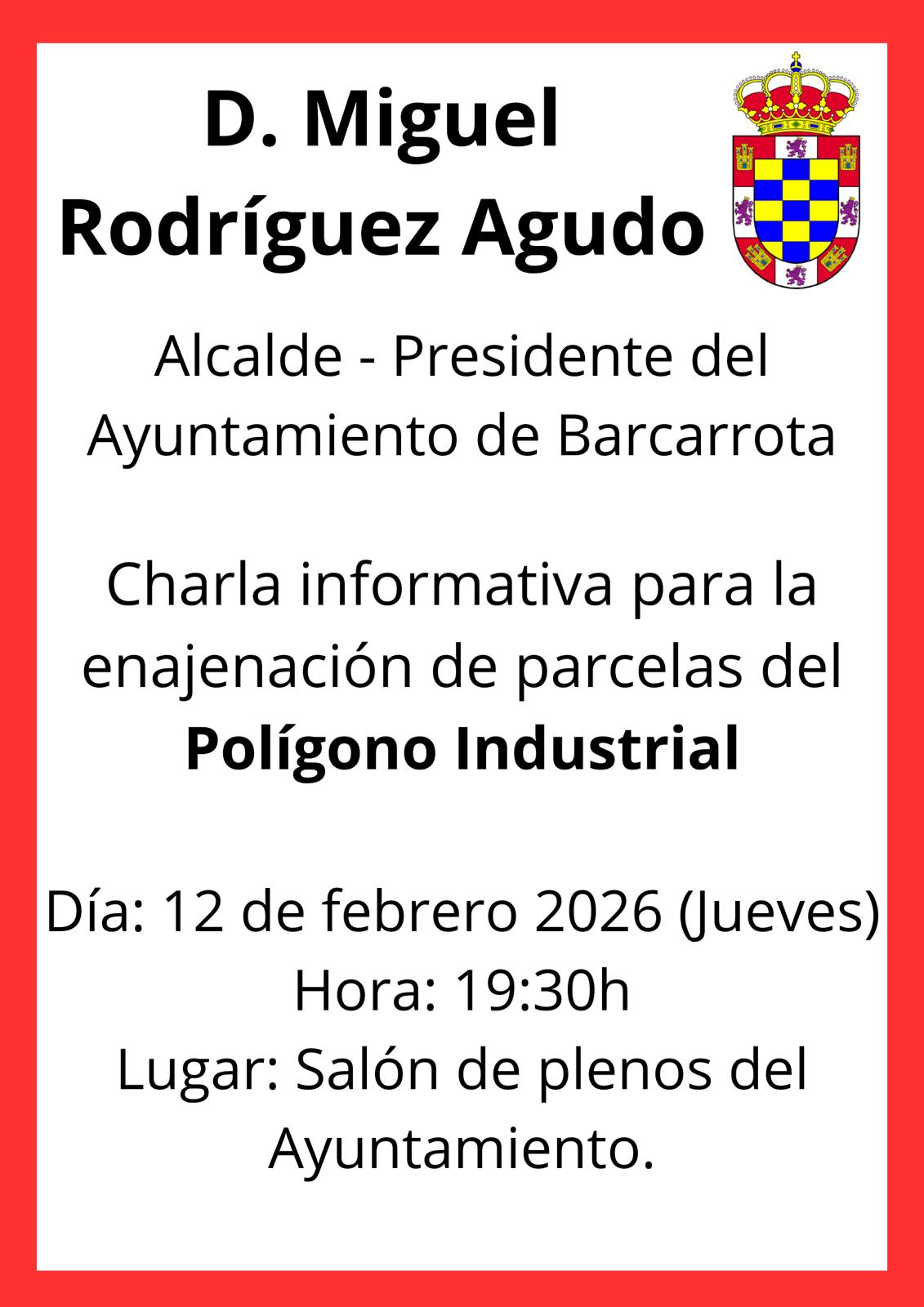 ℹ️ Se ha publicado en el Boletín Oficial de la Provincia de Badajoz (BOPBA), en la sede electrónica municipal, el portal de transparencia y en la plataforma de contratación del sector público el anuncio de licitación para la enajenación de parcelas del polígono industrial. Fecha de publicación: lunes, 16 de febrero de 2026.