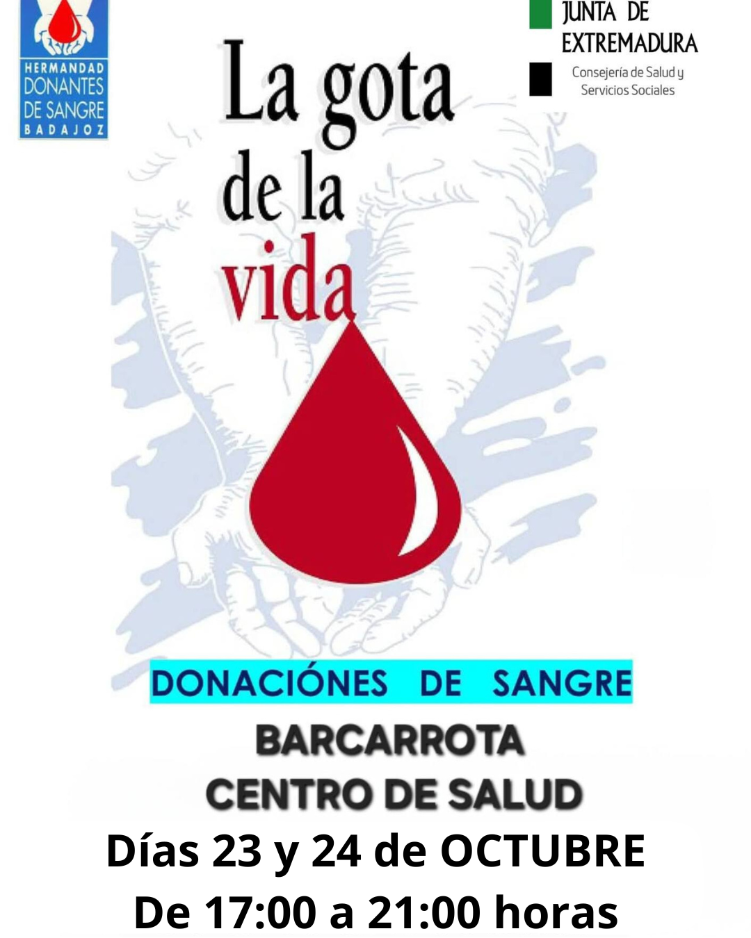 Los próximos 23 y 24 de octubre, un equipo de la Hermandad de Donantes de Sangre de Badajoz, se desplazará hasta Barcarrota para realizar extracciones a todas aquellas personas que lo deseen.
