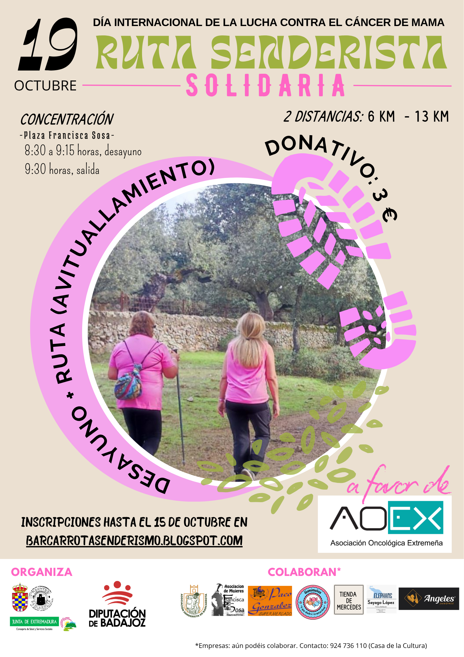 El próximo domingo 𝟏𝟗 𝐝𝐞 𝐨𝐜𝐭𝐮𝐛𝐫𝐞, con motivo del Día Internacional de la Lucha Contra el Cáncer de Mama, se realizará una ruta senderista solidaria a favor de la 𝐀𝐬𝐨𝐜𝐢𝐚𝐜𝐢𝐨́𝐧 𝐎𝐧𝐜𝐨𝐥𝐨́𝐠𝐢𝐜𝐚 𝐄𝐱𝐭𝐫𝐞𝐦𝐞𝐧̃𝐚.