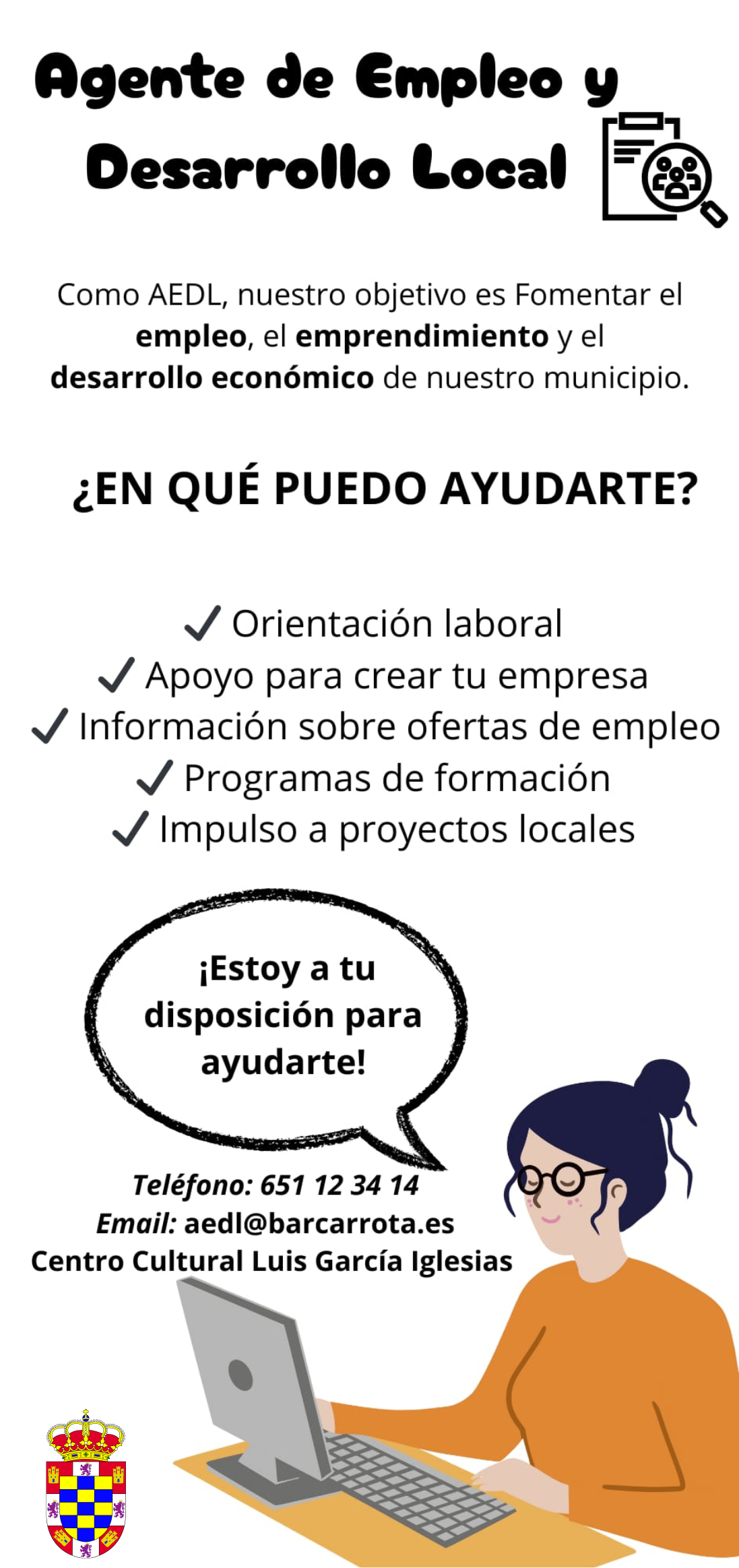 En el cartel adjunto se presenta el servicio de la Agencia de Empleo y Desarrollo Local de Barcarrota, con el que pueden contactar bien por teléfono (651 12 34 14), bien por correo electrónico (aedl@ayuntamiento.es), y/o bien presencialmente en el Centro Cultural "Luis García Iglesias", en horario de 8:00 a 15:00 horas.