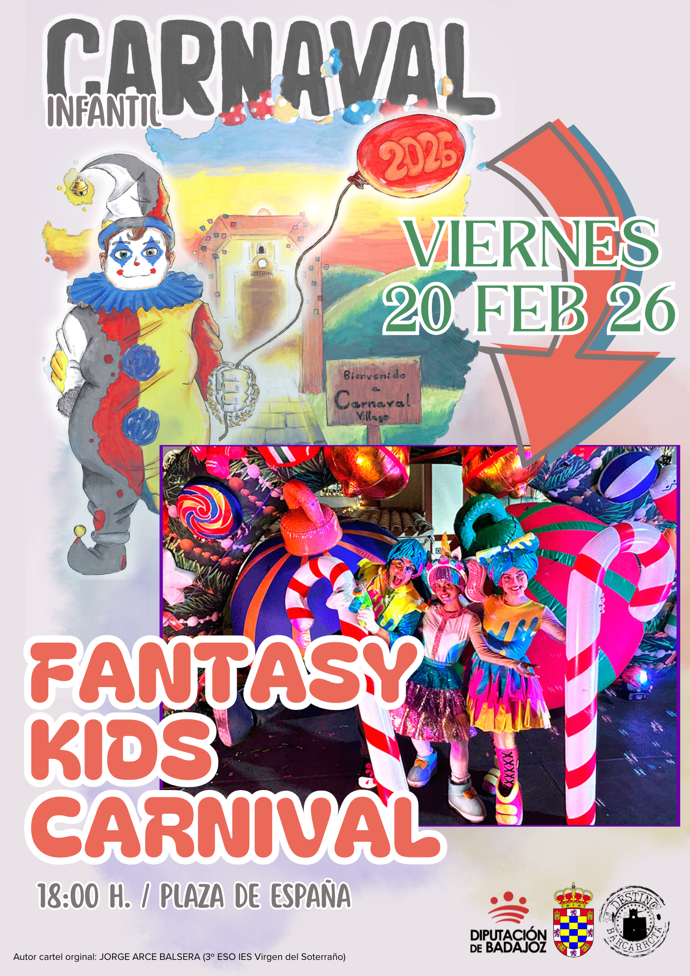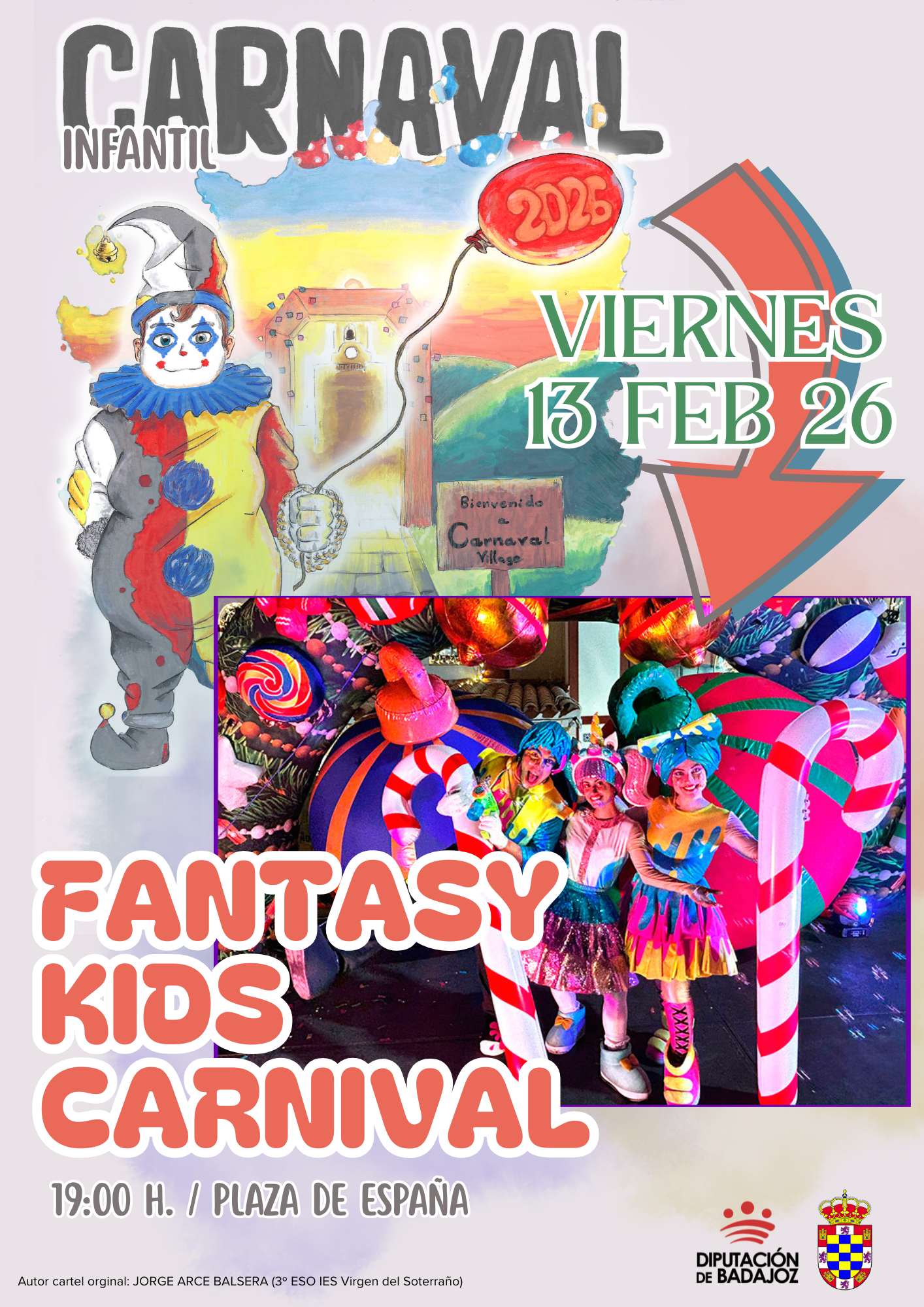 Este viernes 13 de febrero, a las 19:00 horas, en la Plaza de España -si hubiera modificaciones de hora y lugar, se informará por este mismo medio-, se podrá disfrutar del espectáculo "Fantasy Kids Carnival", a través del Plan de Dinamización Cultural de Diputación de Badajoz.