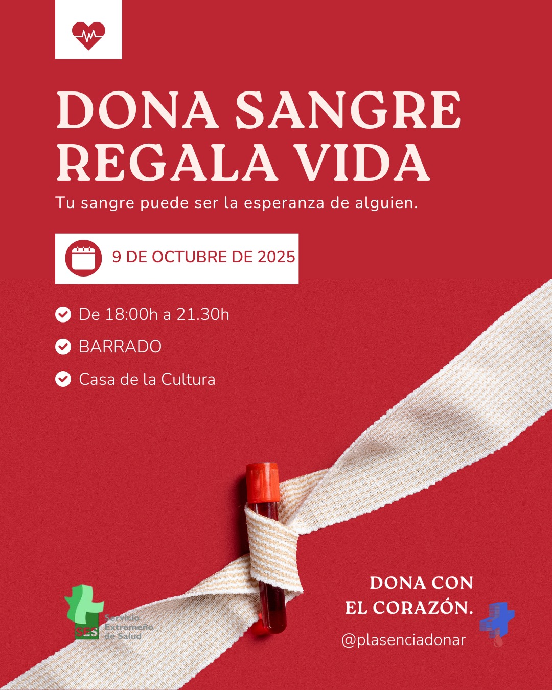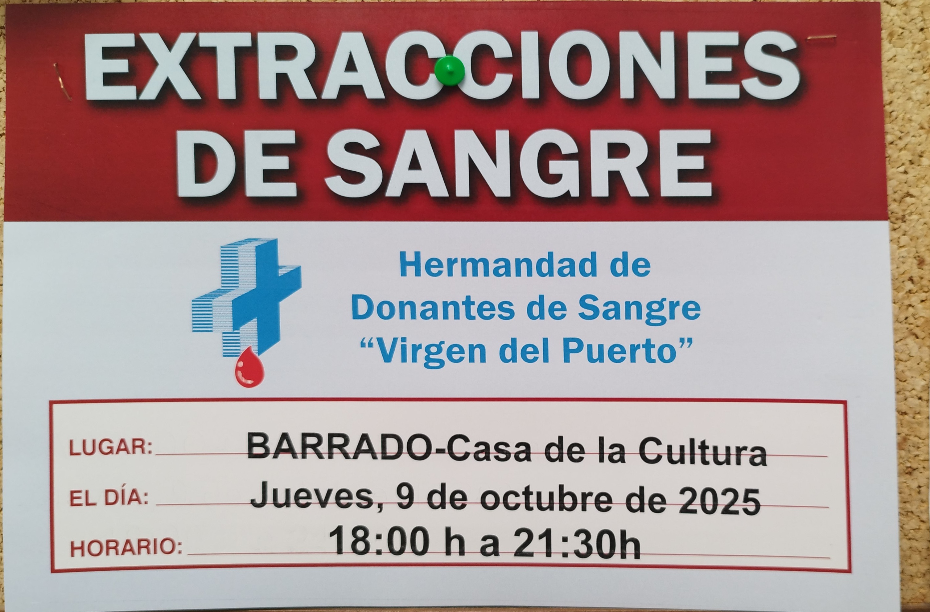 Se comunica que esta tarde de 6 a 9:30 h el banco de sangre hará extracciones en la casa de cultura. Piensa que en algún momento de nuestra vida la podemos necesitar o alguien de nuestra familia. Con una bolsa se pueden salvar tres vidas. DONA 🩸.Se ruega no aparcar en el aparcamiento anexo a la entrada.