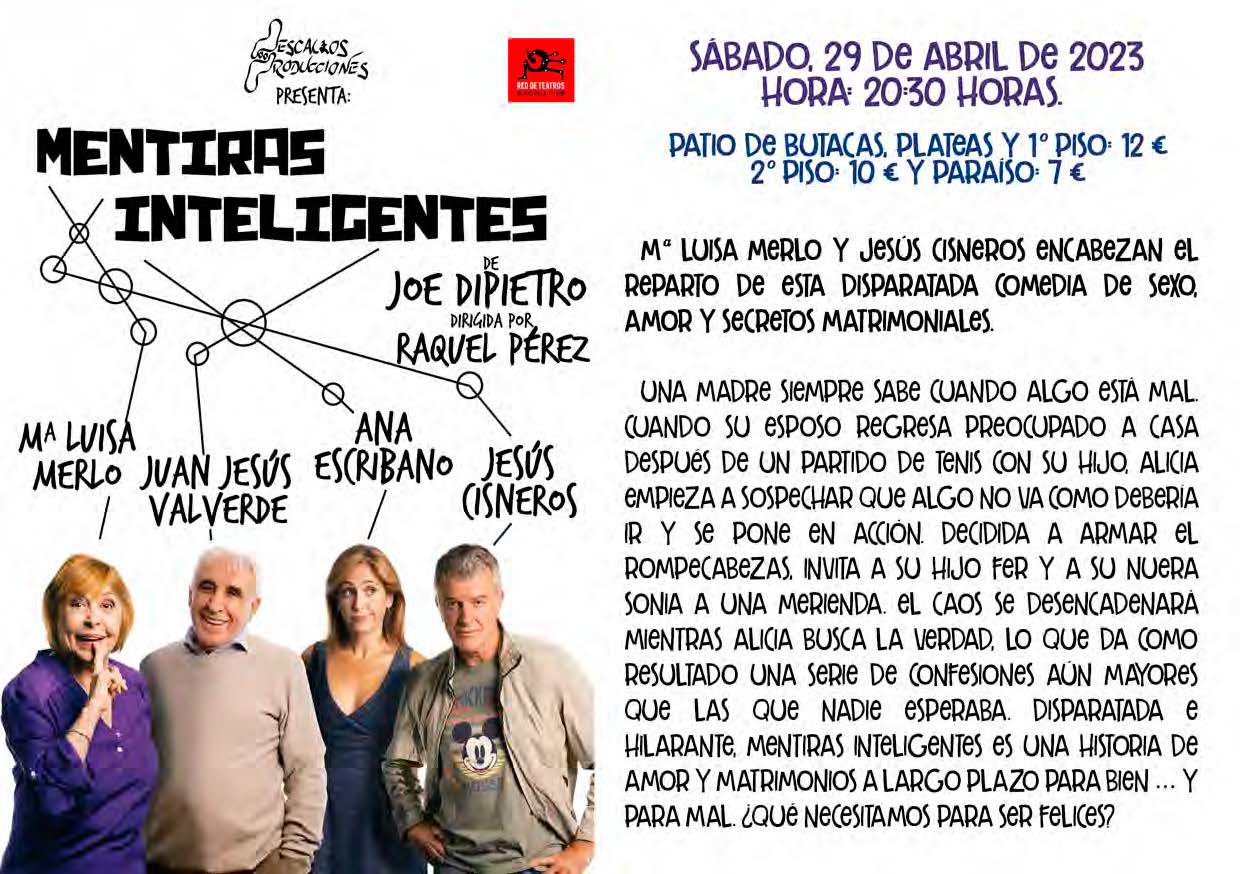 Hoy a las 2030 h en el Teatro Cervantes de Béjar tendrá lugar la obra Mentiras inteligentes, Mª Luisa Merlo y Jesús Osneros encabezan el reparto de esta disparatada comedia. siendo el precio en el patio de butacas, platea y 1º piso 12 €, 2º piso 10 € y paraíso 5 €.