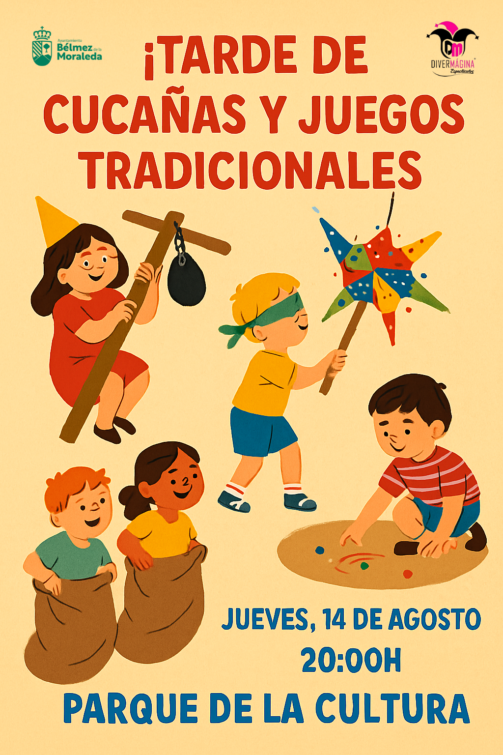 Este jueves 14 de agosto a las 20:00h te esperamos en el Parque de la Cultura para disfrutar de una tarde de cucañas y juegos tradicionales.