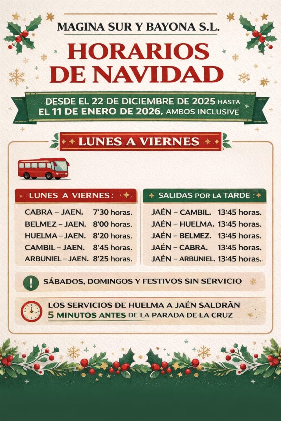 HORARIO AUTOBUSES DE JAÉN2025-12-22 13:15:00Info GeneralHorarios especiales de Navidad