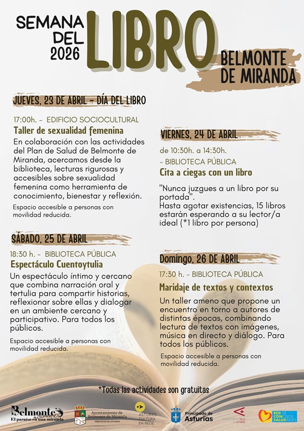 El programa incluye un taller de sexualidad femenina organizado por el Plan de Salud de Belmonte de Miranda, en donde se propone además acercar a la ciudadanía lecturas rigurosas y accesibles sobre sexualidad, además de la importancia de la biblioteca pública como espacio seguro para todas las personas, cercano y dinamizador de la cultura. La iniciativa “Cita a ciegas con un libro”, el espectáculo participativo “Cuentoytulia” y el taller cultural “Maridaje de textos y contextos”, combi(...)