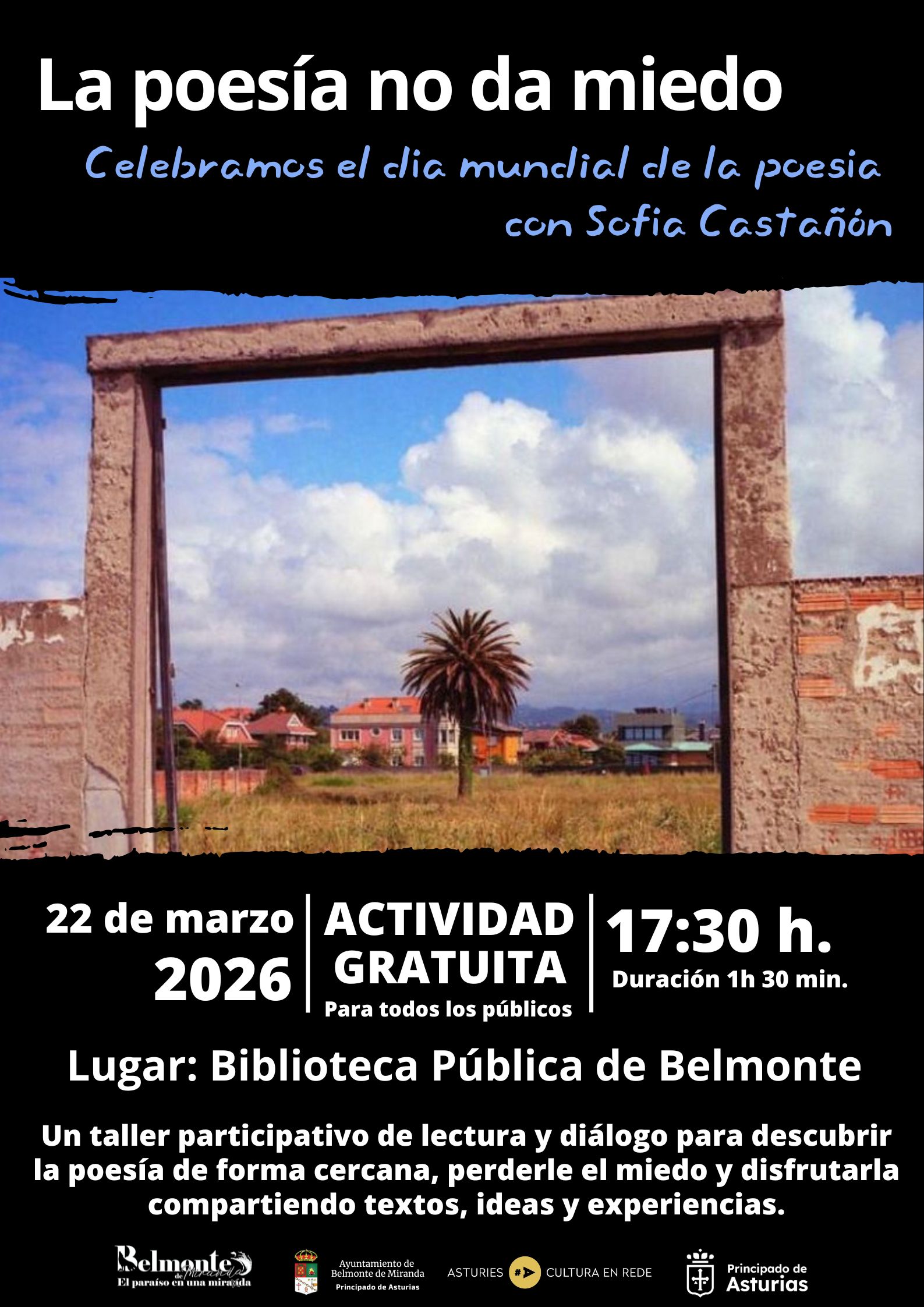 El próximo domingo 22 de marzo a las 17:30 horas, celebramos el Día internacional de la poesía en la Biblioteca Pública Municipal de Belmonte de Miranda acogerá el taller literario “La poesía no da miedo”, una actividad gratuita y abierta a todos los públicos, con una duración aproximada de 90 minutos.