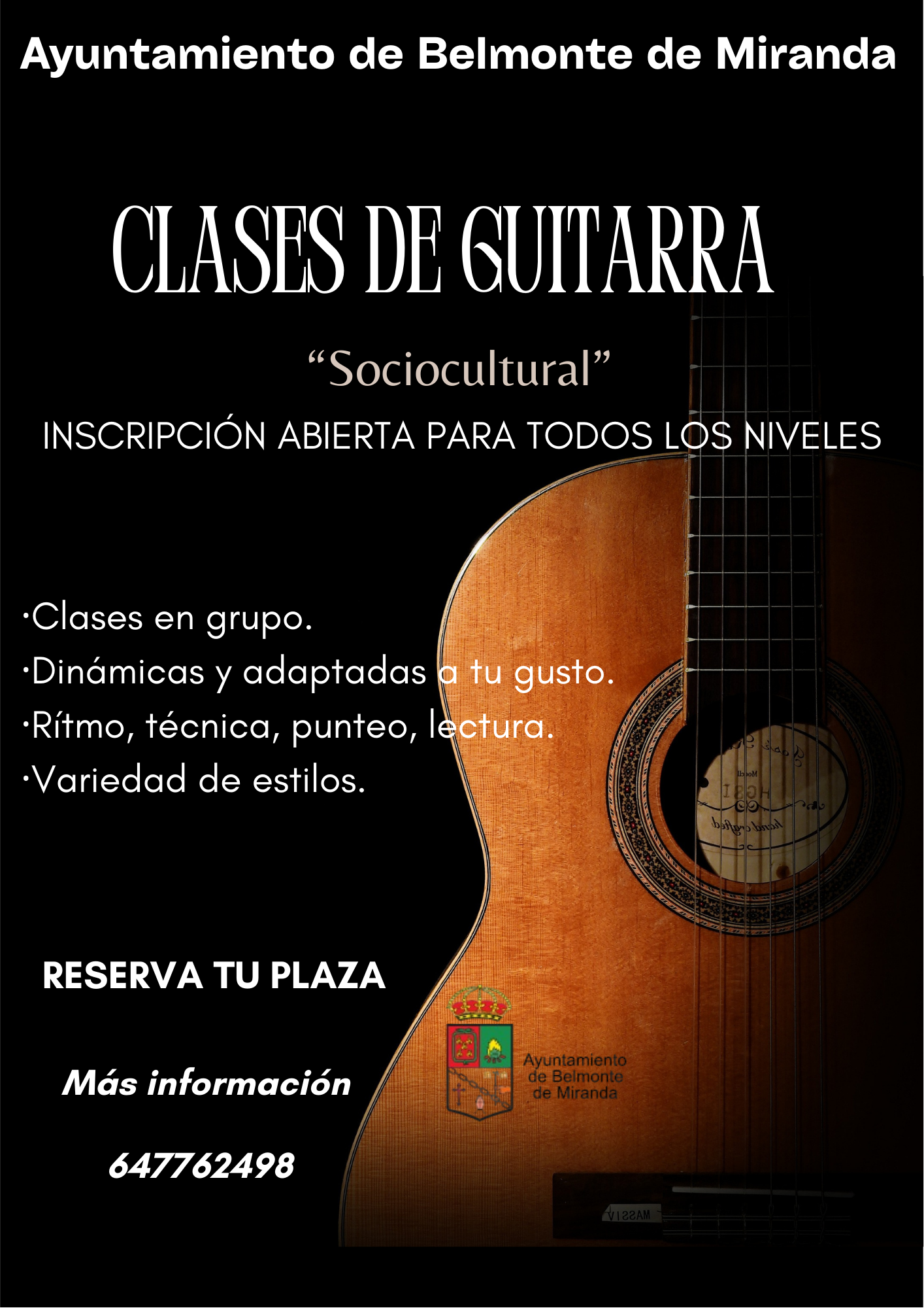 🎸 El Ayuntamiento de Belmonte de Miranda abre la inscripción para clases de guitarra socioculturales, dirigidas a todos los niveles. Si siempre has querido aprender a tocar o mejorar tu técnica, esta es tu oportunidad.