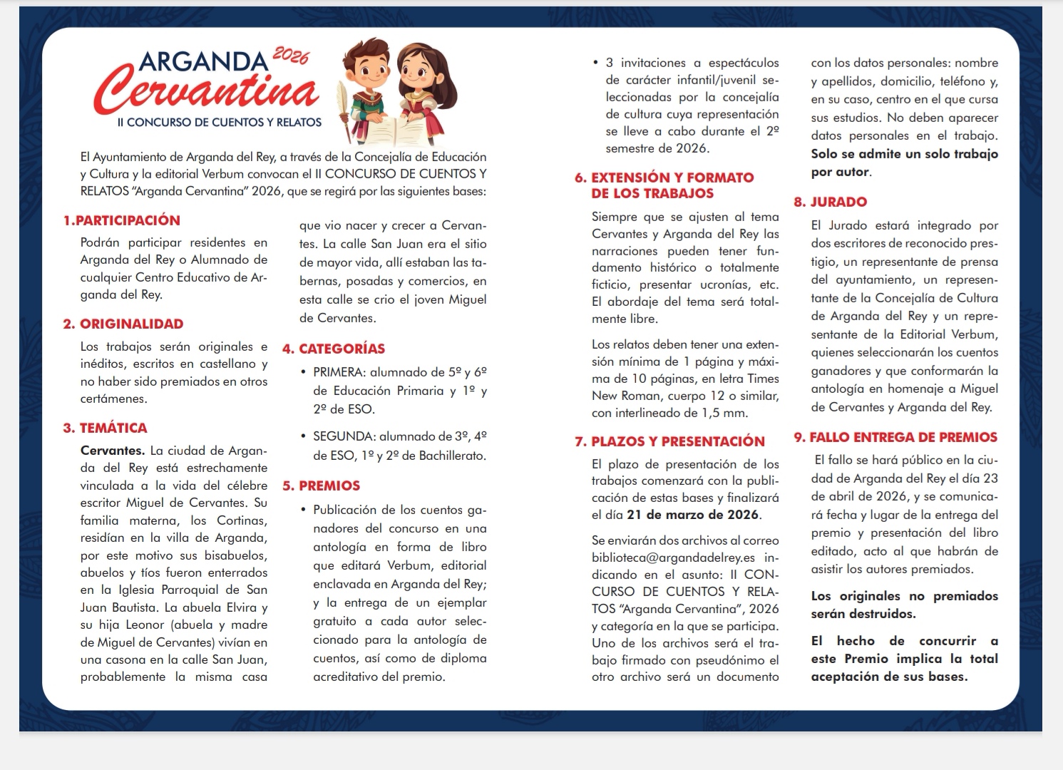 Con motivo del Día del Libro (23 de abril), el Ayuntamiento, a través de la Concejalía de Educación y Cultura y en colaboración con la editorial Verbum, organiza el II Concurso de Cuentos y Relatos “Arganda Cervantina”, un certamen que rinde homenaje a Miguel de Cervantes, nuestro vecino más ilustre.