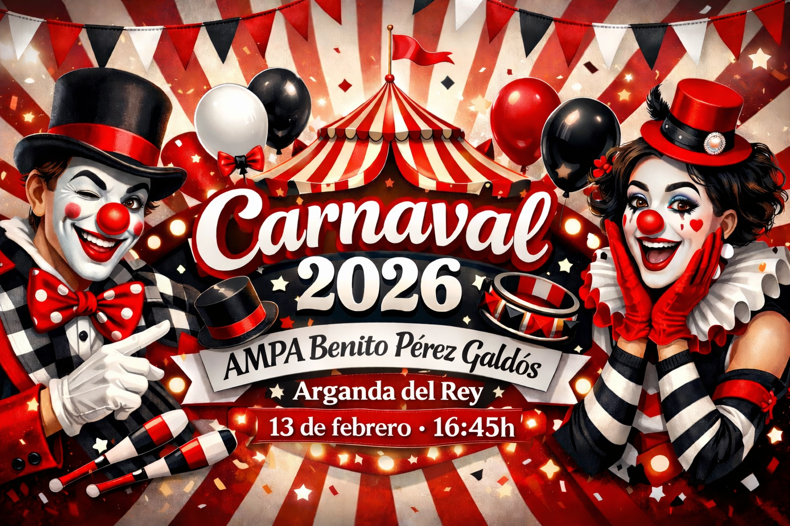 Desde el AMPA Benito Pérez Galdós os escribimos para invitaros a participar en el Desfile de AMPAS de Carnaval 2026 de Arganda del Rey, ¡que este año llega con una temática muy divertida! 🎪✨