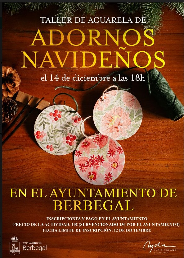 El Ayuntamiento de Berbegal organiza un taller de acuarela de adornos navideños, que tendrá lugar el domingo 14 de diciembre a las 18:00 horas en el Ayuntamiento.